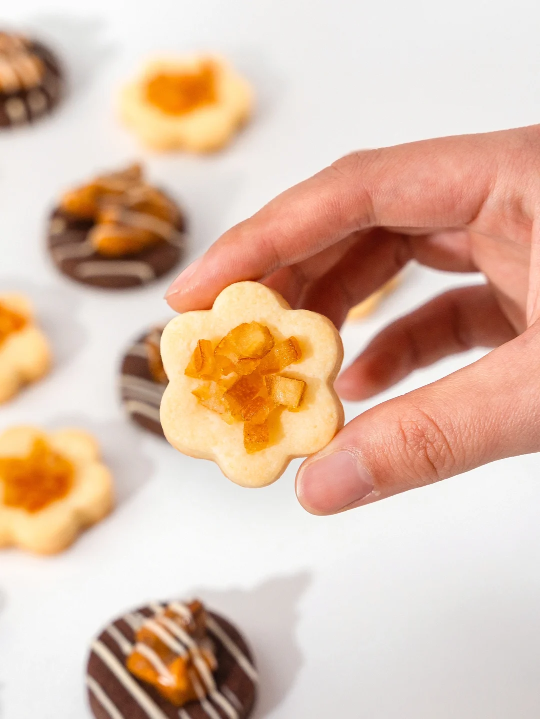 2、原味:刻印出花型,表面放上适量桔香丁,平炉上下火170°C烤制13分钟。