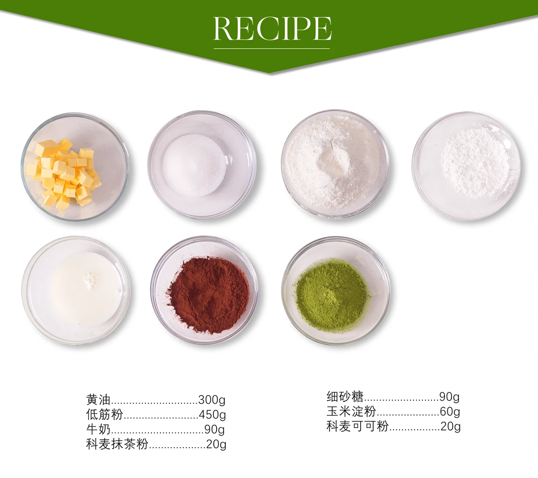 1、除了可可粉和抹茶粉的材料均分为3份。