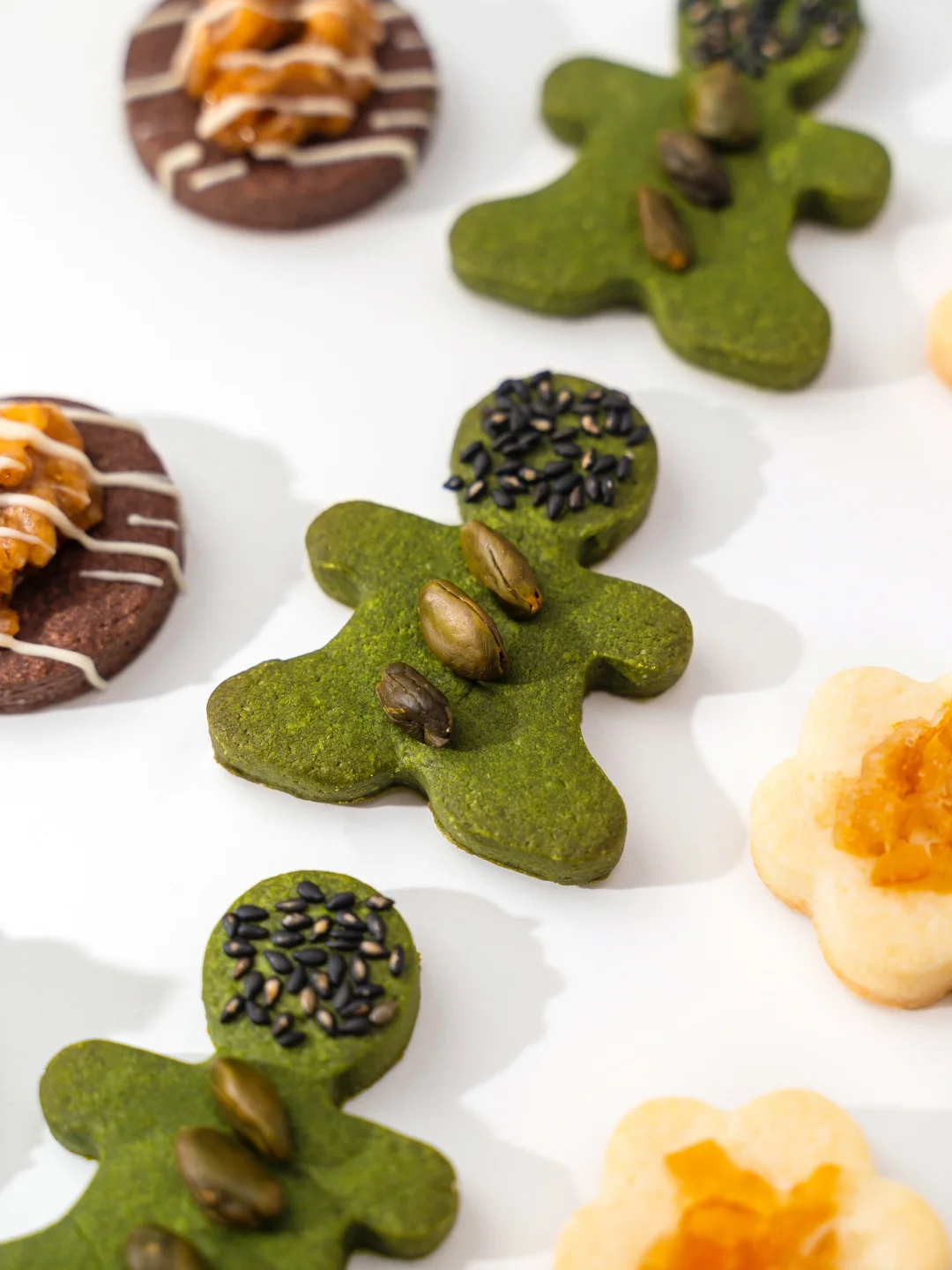 1、抹茶味:使用雪人模具刻印出形状,表面刷上适量清水,头部撒上适量黑芝麻,身体部位放上3颗开心果,平炉上下火170°C烤制13分钟。
