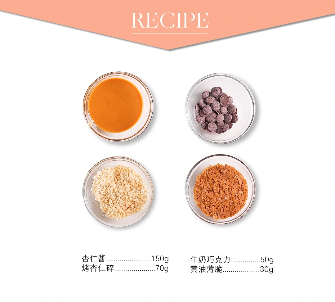 1、牛奶巧克力融化后,依次加入杏仁酱、薄脆和烤杏仁碎搅拌均匀。