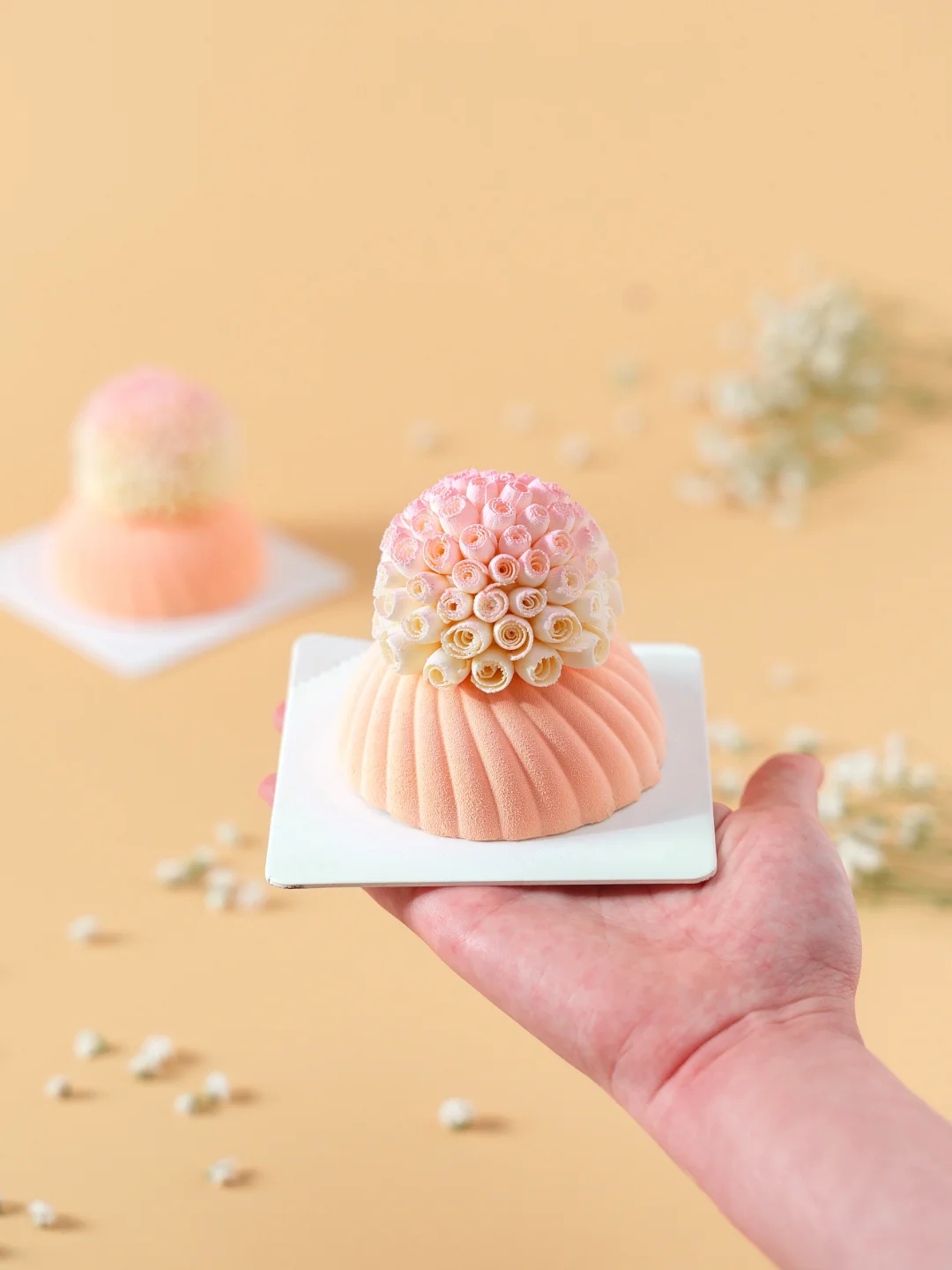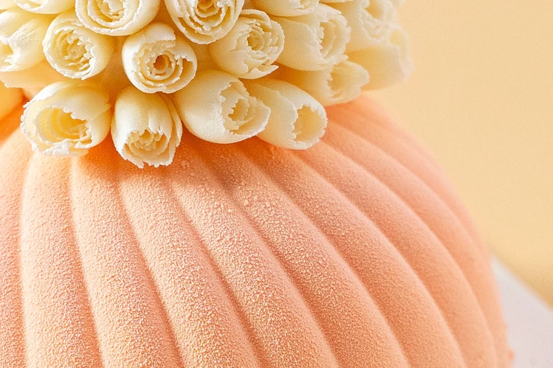 2、小圆球慕斯脱模后,表面均匀裱挤一圈慕斯液并抹平,依次粘合花型巧克力卷呈捧花状后冷冻20分钟。