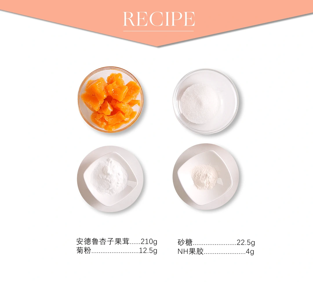 1、杏子果茸加热至40°C,加入拌匀的菊粉、砂糖和NH果胶,快速搅拌煮至沸腾离火。