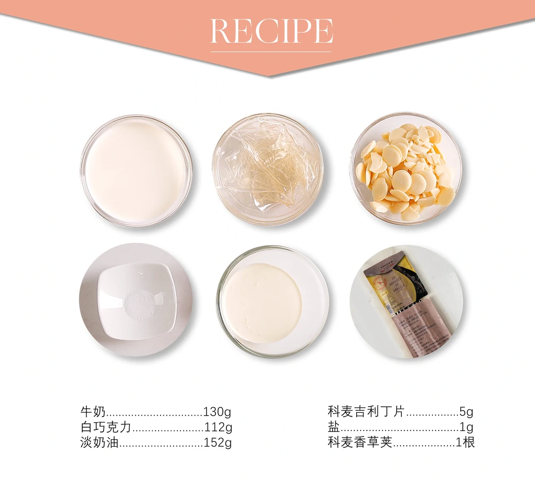 1、香草刮出香草籽后加入到牛奶里微波至80°C,加入吉利丁融化均匀。