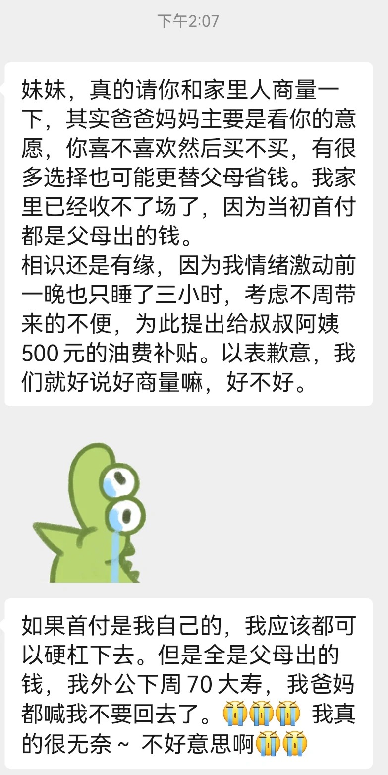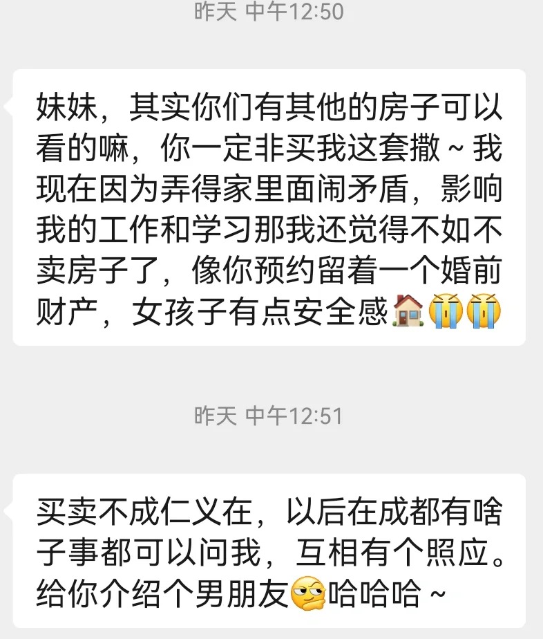 我真的做的很过分吗??? 买房签了合同,过了两天房主反悔不想卖了,签合同前已经劝了她很多次让她回去冷静后再来谈要不要卖给我,当晚她也是和她家里人通过电话最后决定卖给我,然后签订购房合同,现在不想卖了也不愿意按合同违约条款赔付,弄的我好像做的很过分一样,我一直在履行合同上的流程,我也只想依据合同办事,真的是我太过分了吗#矛盾 #成都买房 #求助帖