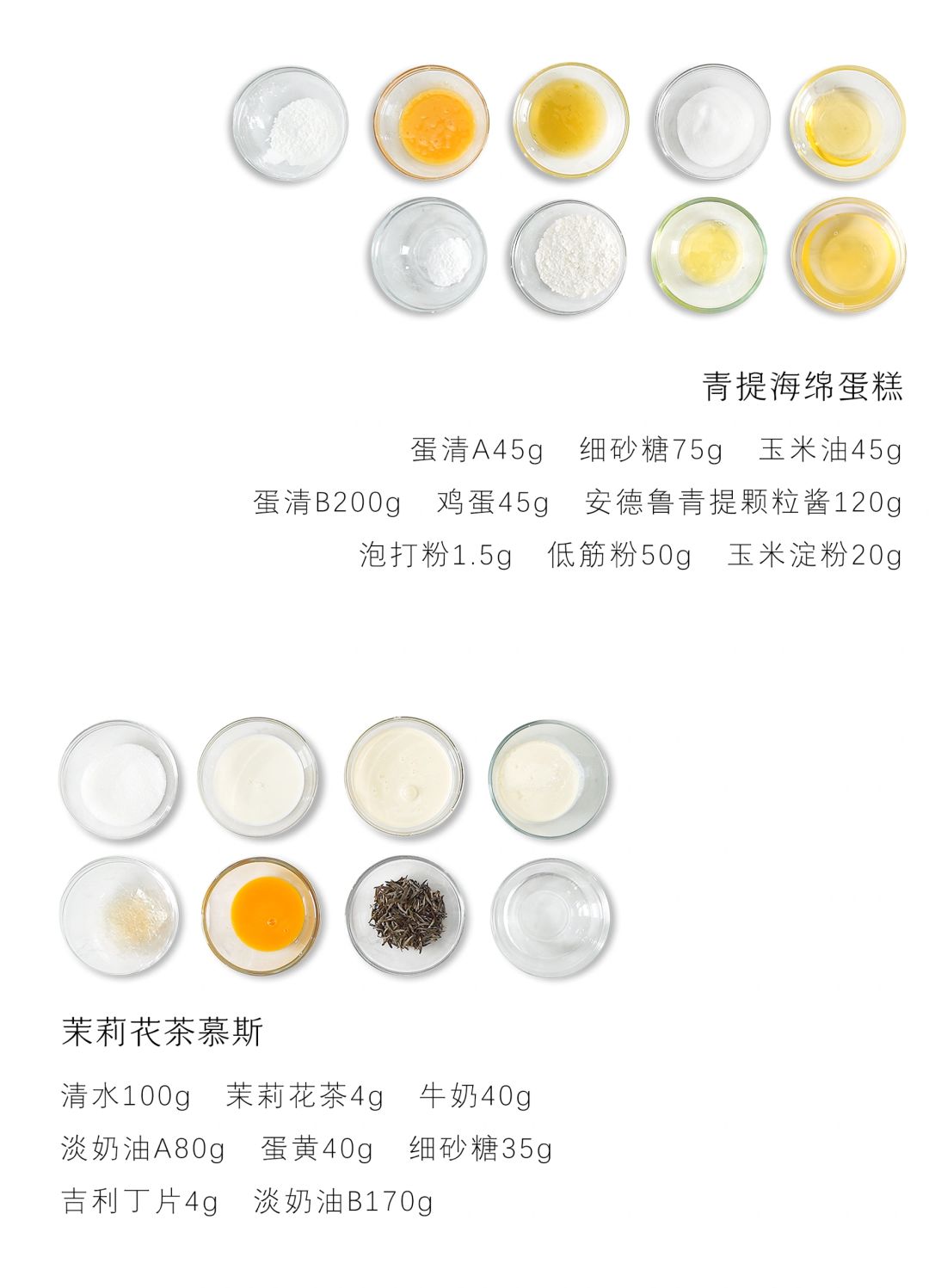 1、清水和茉莉花茶加热煮沸,加入牛奶继续煮沸关火,保鲜膜密封浸泡萃取3分钟,再重复以上操作2次,均匀过滤出奶液,倒回锅中并加入淡奶油A中小火加热至40°C。