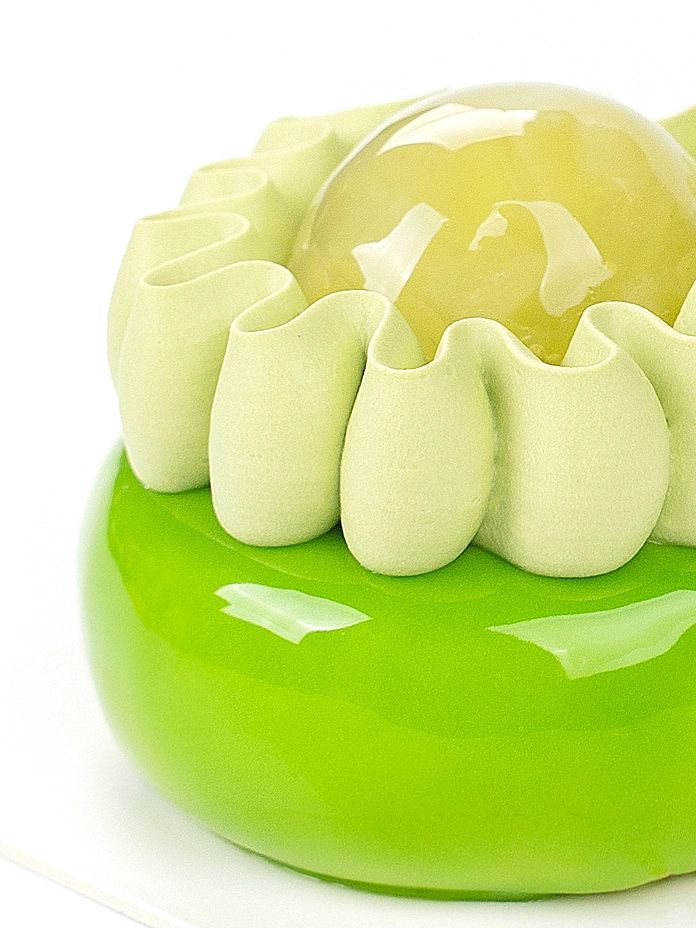 2、慕斯脱模后将底部打磨平整冷冻10分钟,取出回温好的绿色淋面均质后进行淋面操作,温度为35°C。