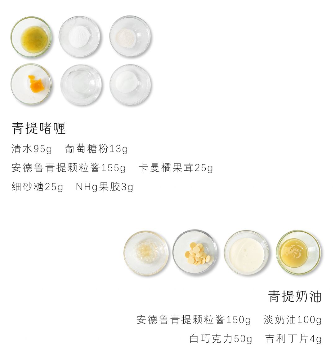 1、青提颗粒酱、卡曼橘果茸、葡萄糖粉和清水搅拌加热至40°C,倒入混合好的NH果胶和砂糖,快速搅拌煮沸并保持沸腾1分钟收稠离火。