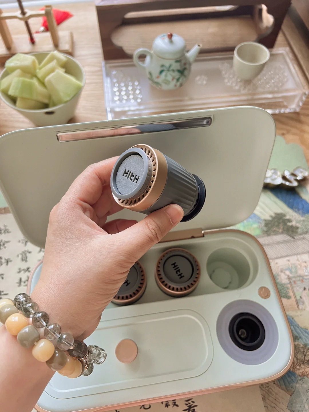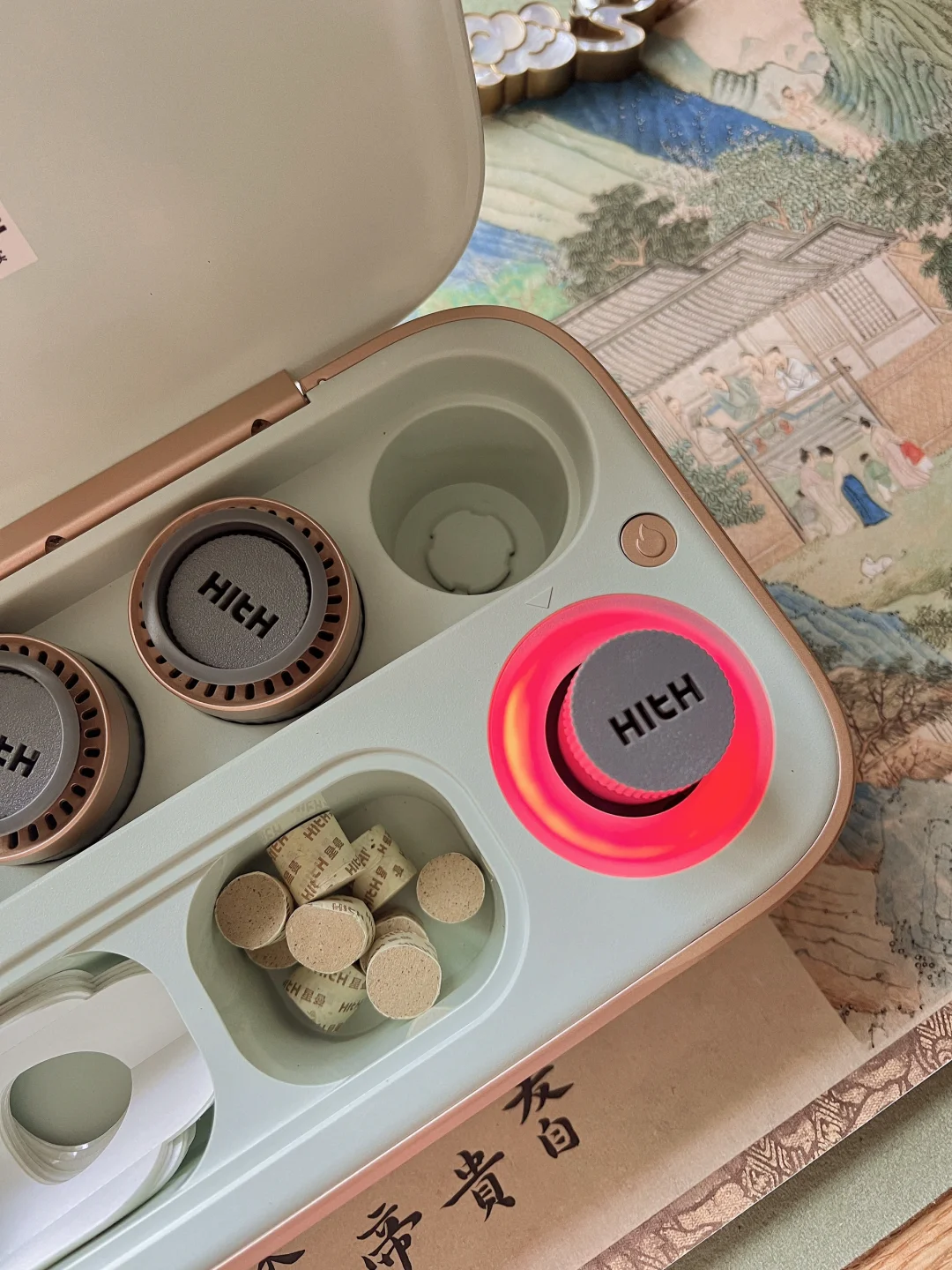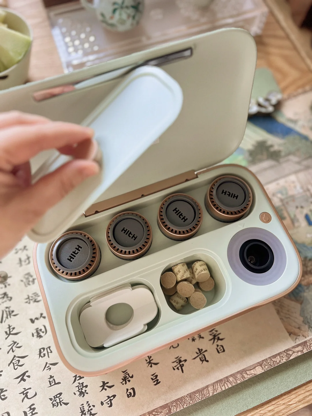 收纳盒自带点火,对于艾灸新手也非常友好,艾烟都被过滤掉了,不呛人。艾灸时扭一扭就能调节温度,相当方便。