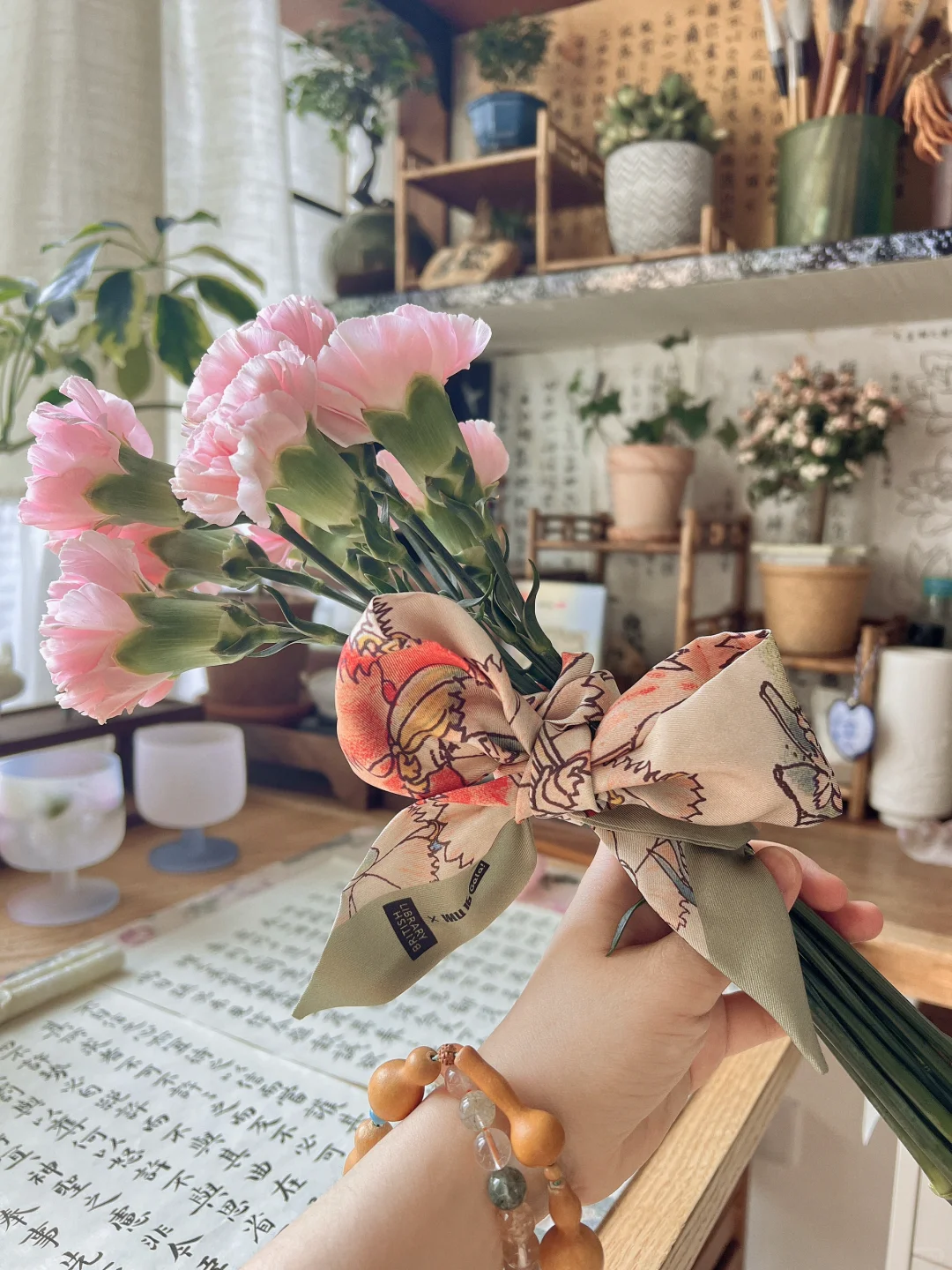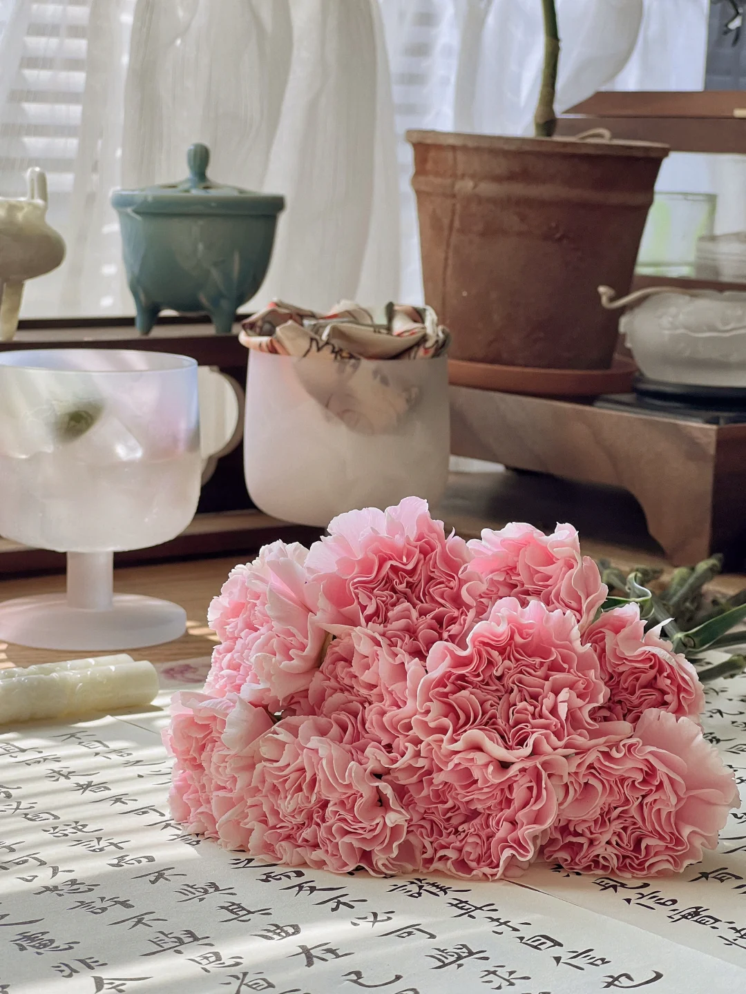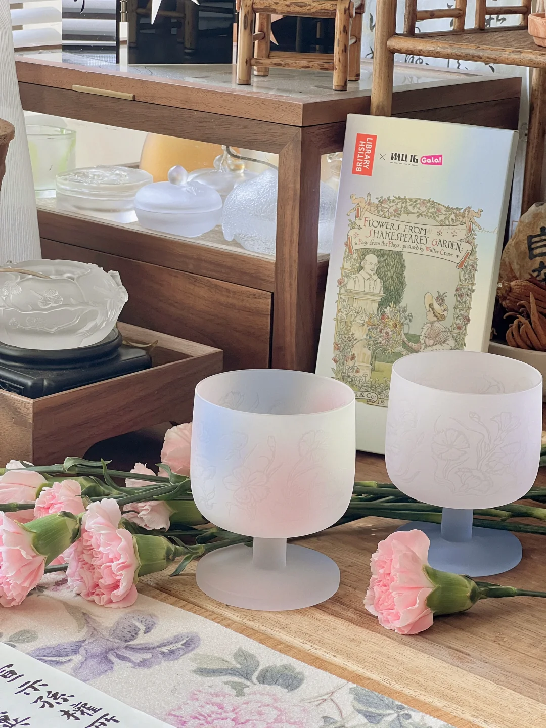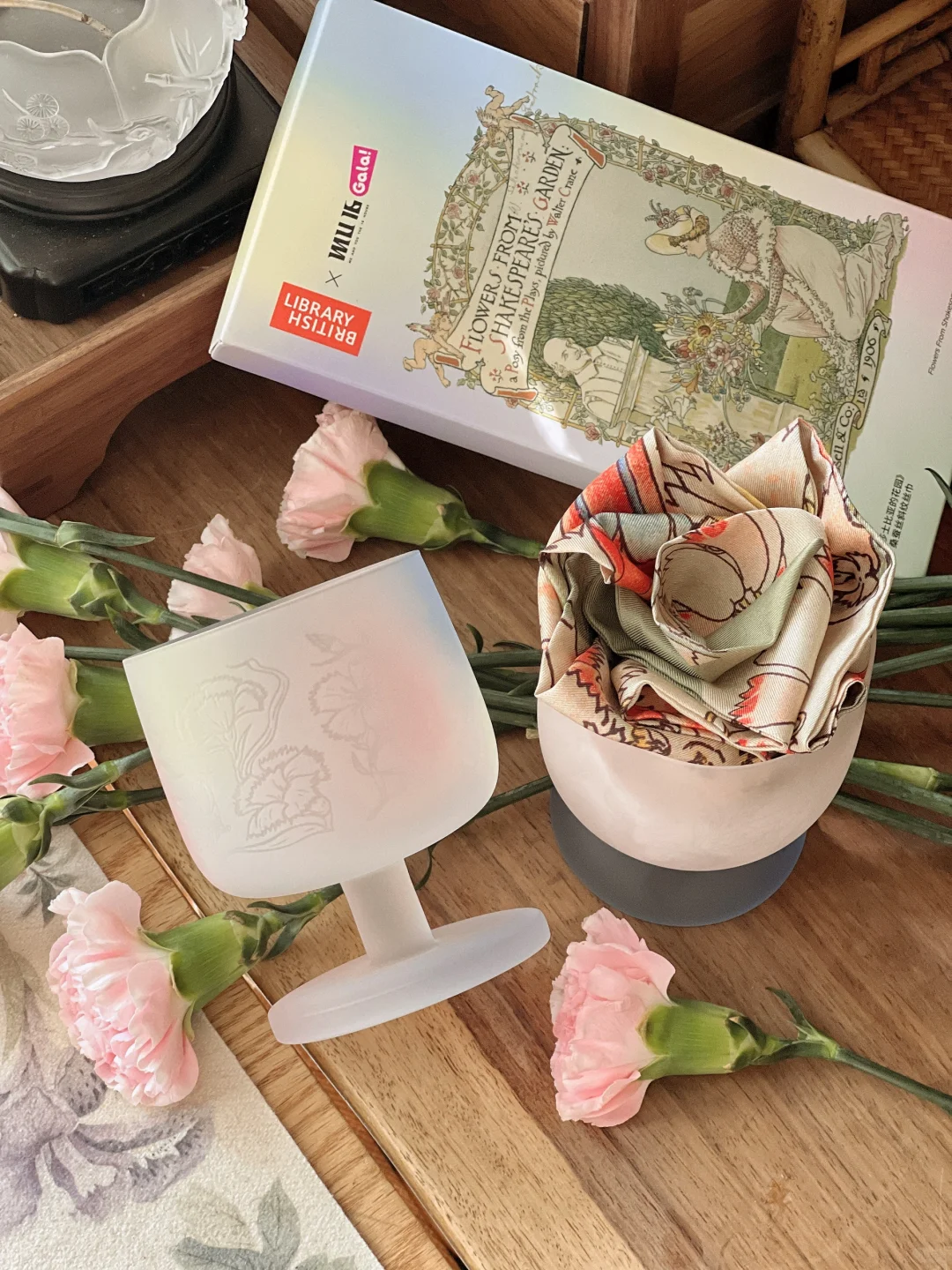 久违了的阳光,照进了书房。 散步带回一束康乃馨,准备插花时,阳光正好洒进来,急忙拿手机捕捉了几张。 阳光留在桌面10分钟,刚刚拍完就散去,时间刚刚好。 喜欢的手工玻璃糖果杯出了莎士比亚套装,内壁精致花纹蚀刻工艺,巧妙的还原原著充满诗意的画作。 原画图案的真桑蚕丝丝巾,灵机一动做了扎花丝带,花束也有了不同风味。