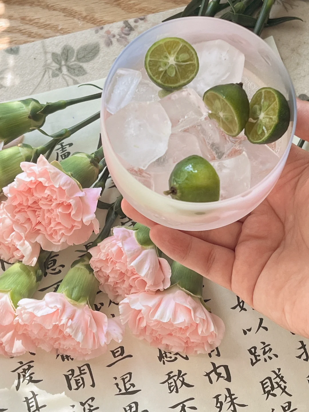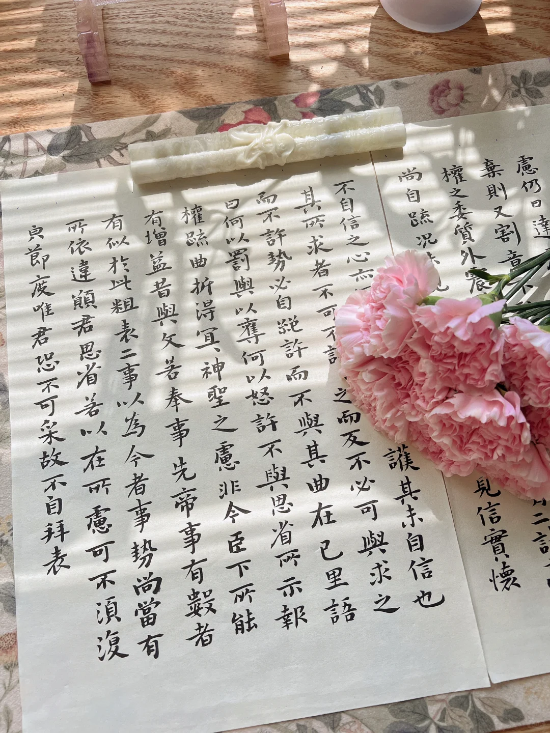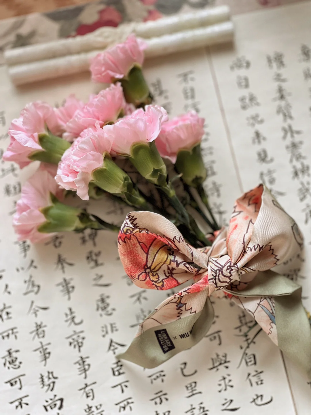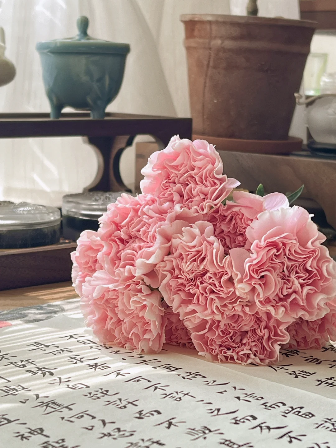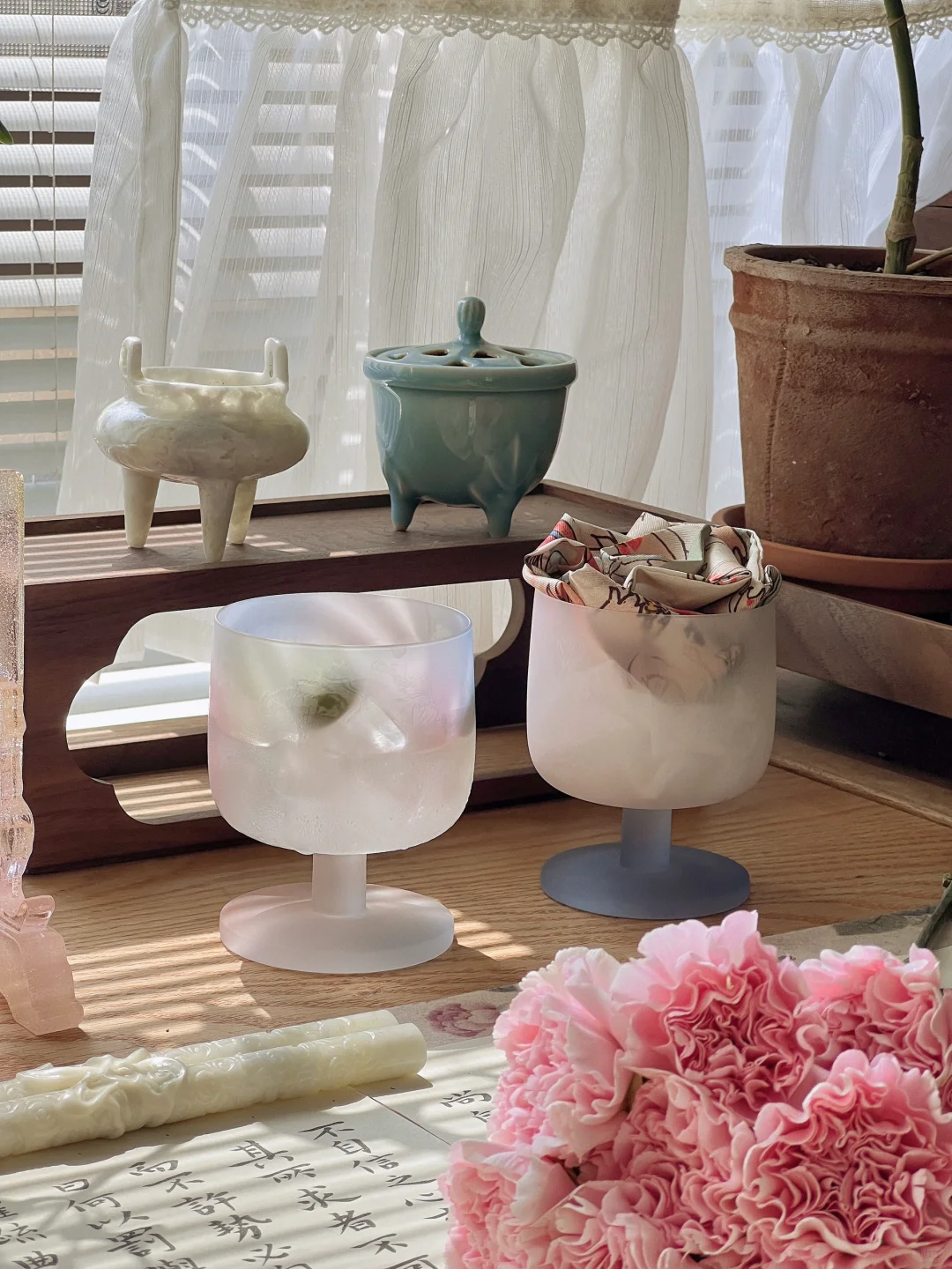 久违了的阳光,照进了书房。 散步带回一束康乃馨,准备插花时,阳光正好洒进来,急忙拿手机捕捉了几张。 阳光留在桌面10分钟,刚刚拍完就散去,时间刚刚好。 喜欢的手工玻璃糖果杯出了莎士比亚套装,内壁精致花纹蚀刻工艺,巧妙的还原原著充满诗意的画作。 原画图案的真桑蚕丝丝巾,灵机一动做了扎花丝带,花束也有了不同风味。