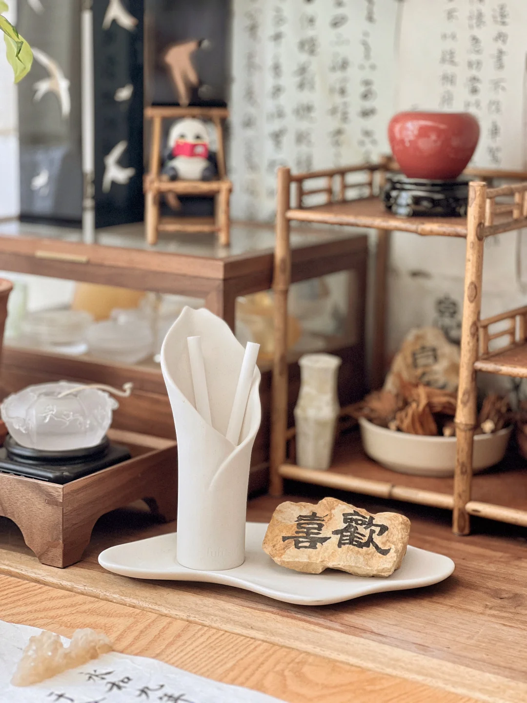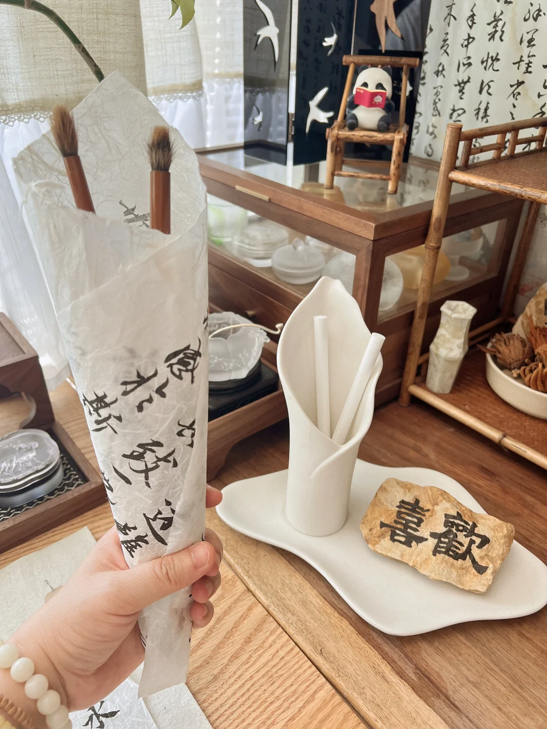 把书写完的作业纸卷成马蹄莲花型,放入毛笔,又是一个不一样的书法小文创。