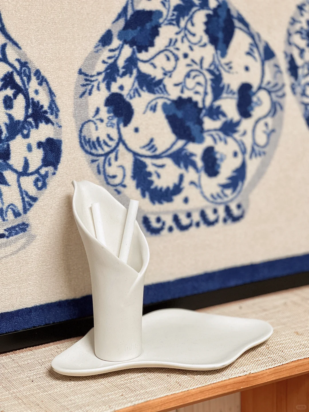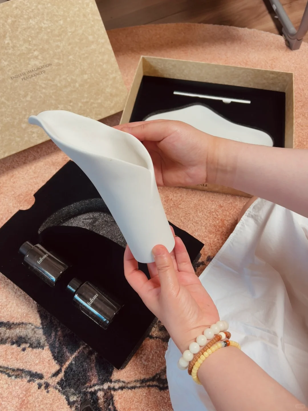 fufusu 拂垠精油无火香薰,霜色的马蹄莲器型陶瓷瓶器,轻触指尖传来手工陶制品的颗粒感。
