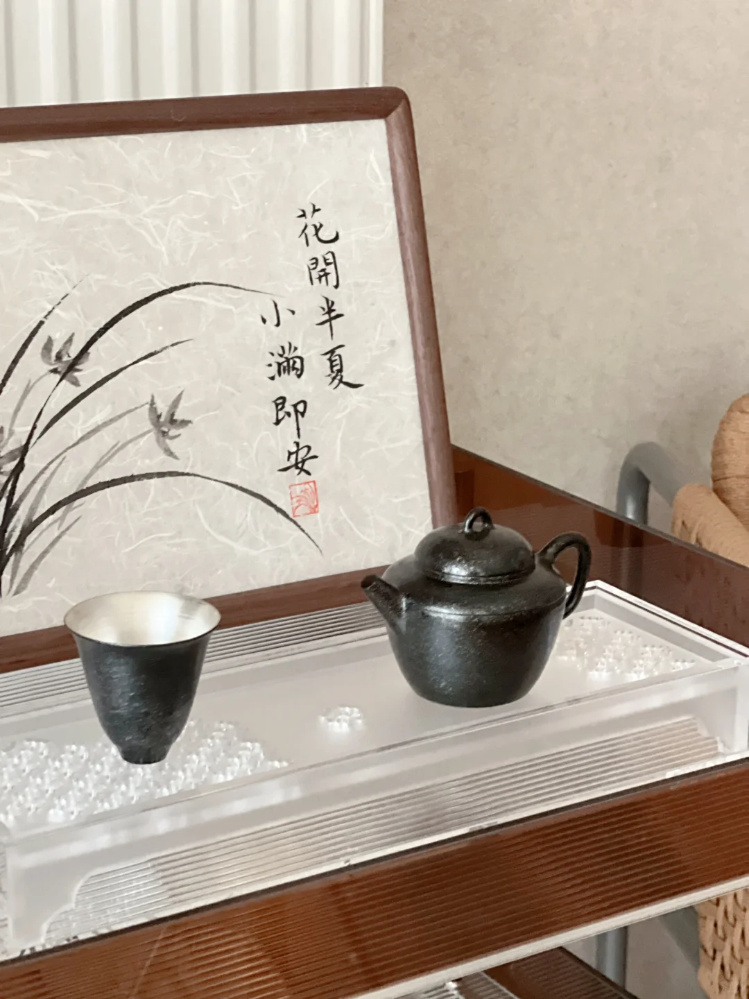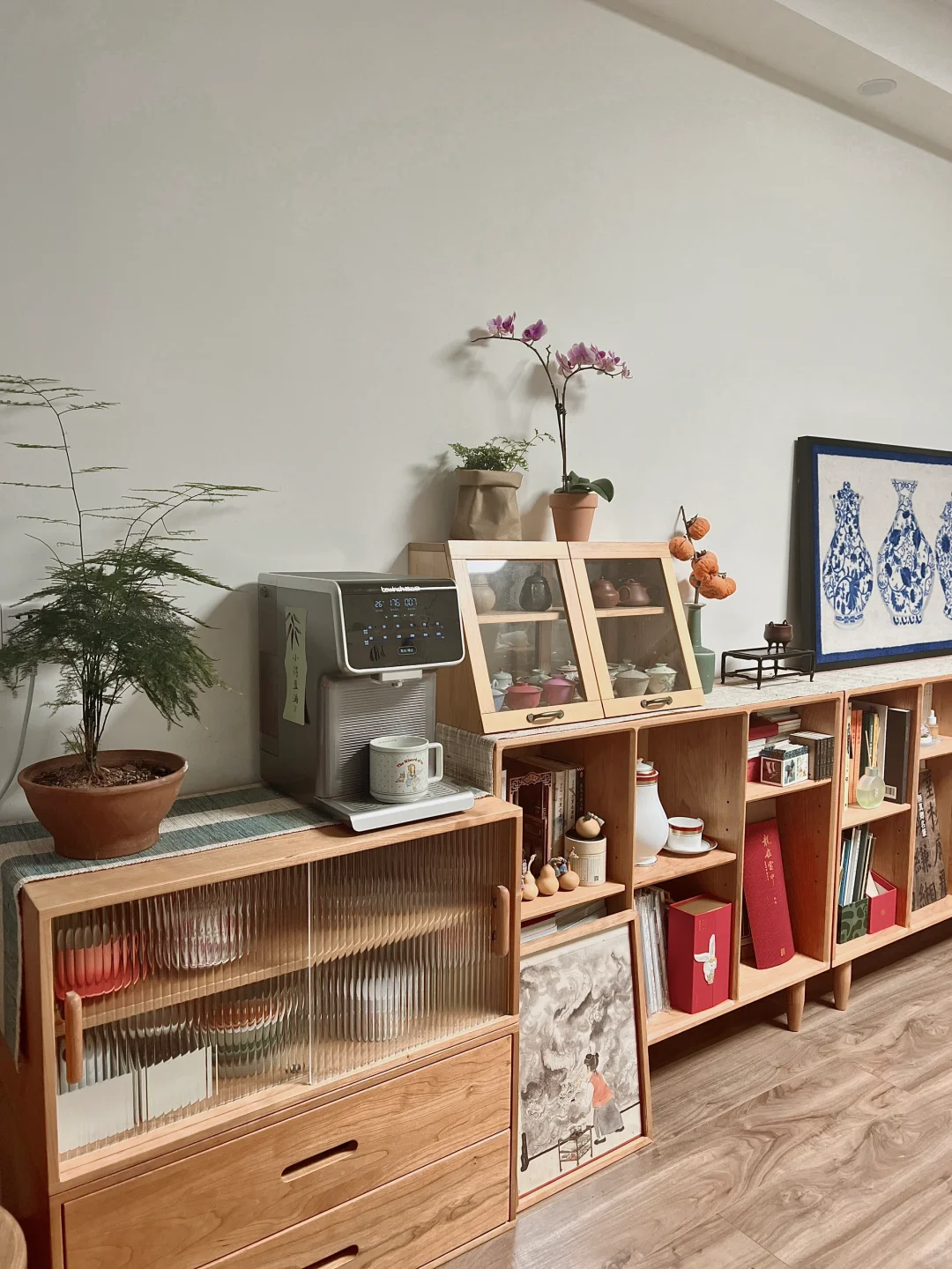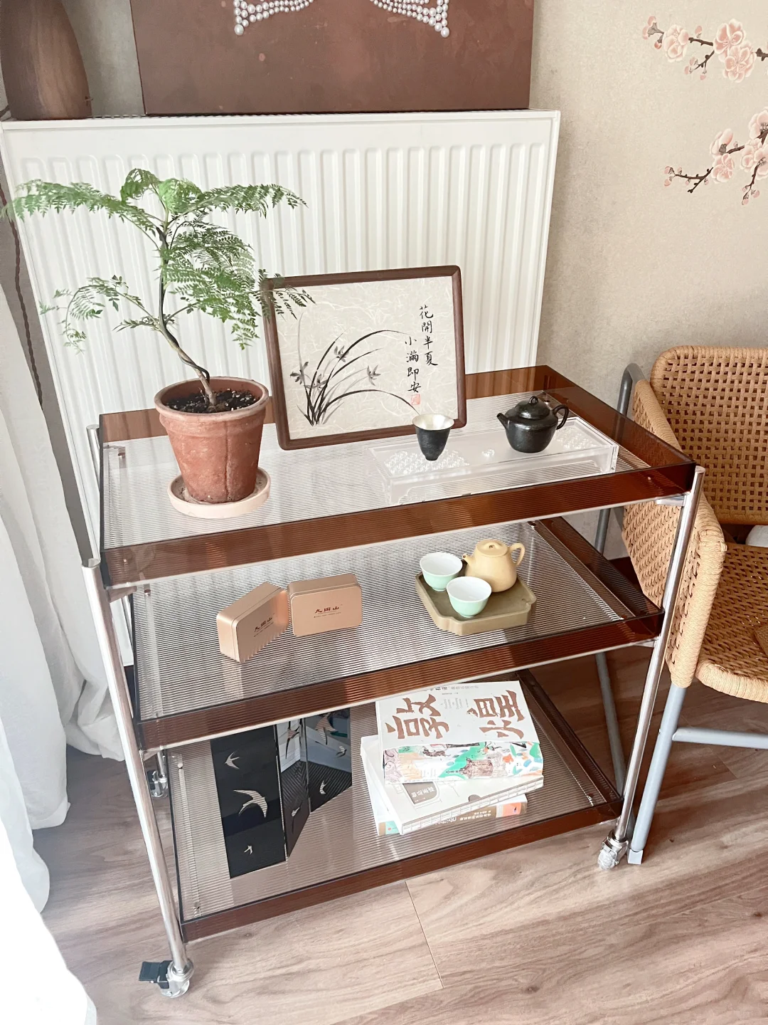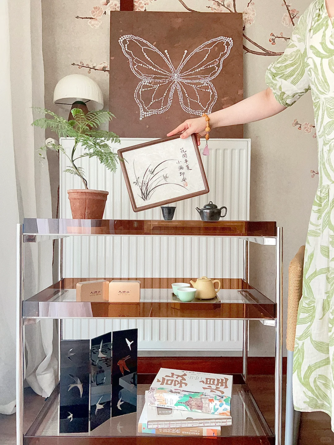 茶室角落更换了亚克力推车置物架,夏天室内照明会减少,亚克力的材质通透感更强,仿长虹玻璃的纹路,整体轻巧明亮,空间感也更大。