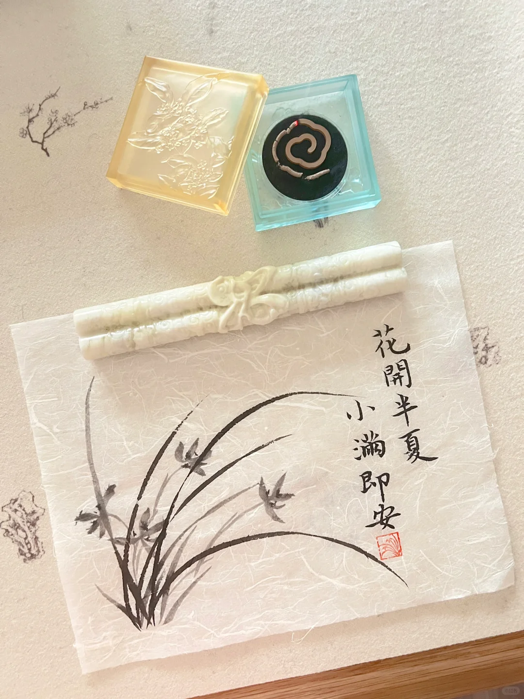 茶台的上层放置了新画的兰花图,题跋“花开半夏,小满即安”。