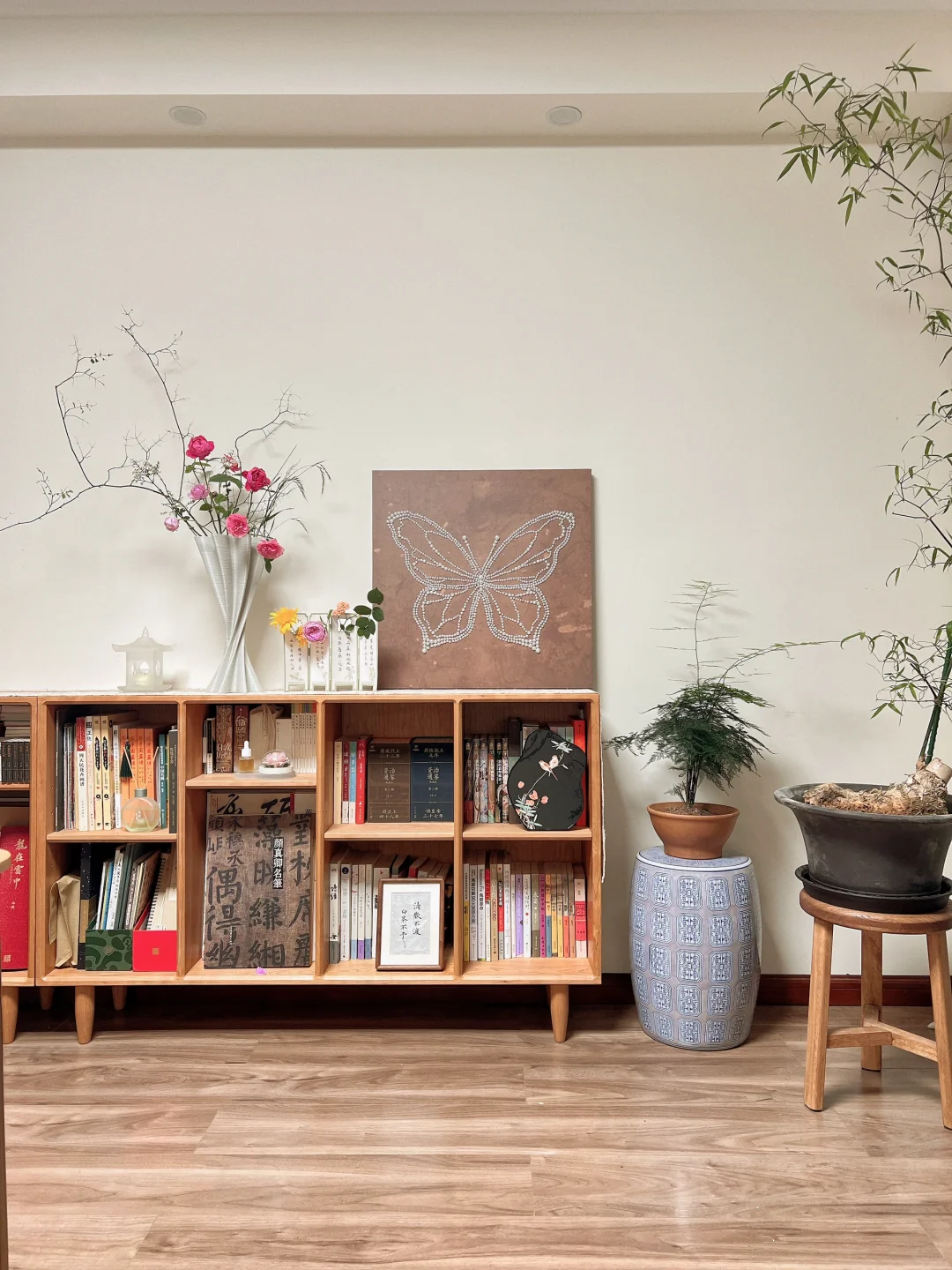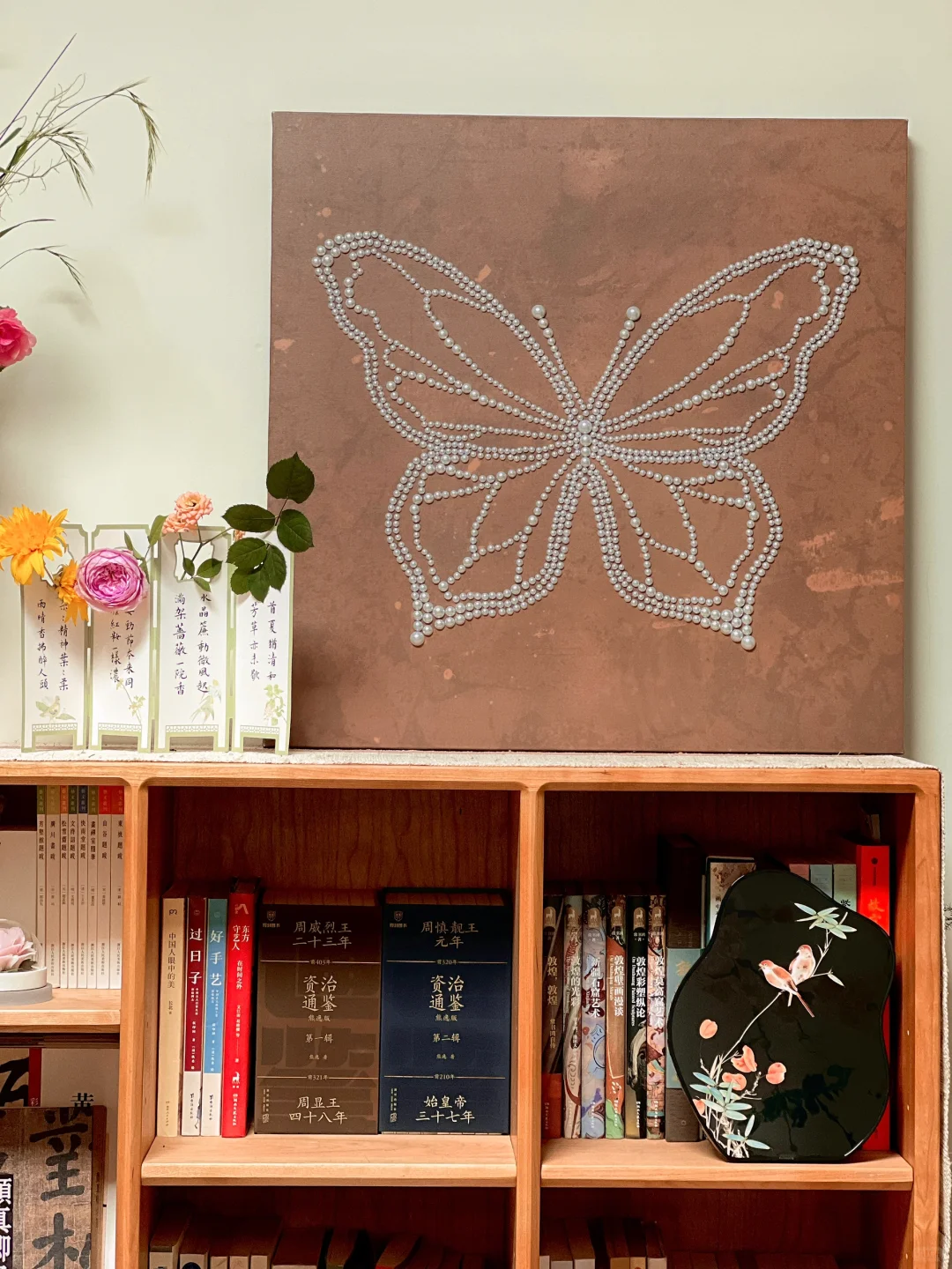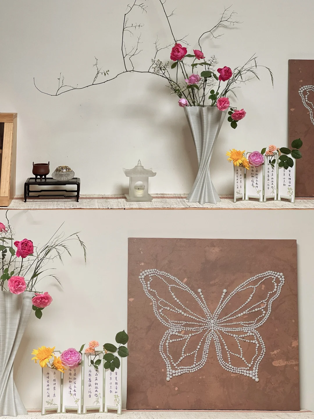 再搭配立体珍珠蝴蝶装饰画,手写花卉书法屏风,把夏天搬入了家里。