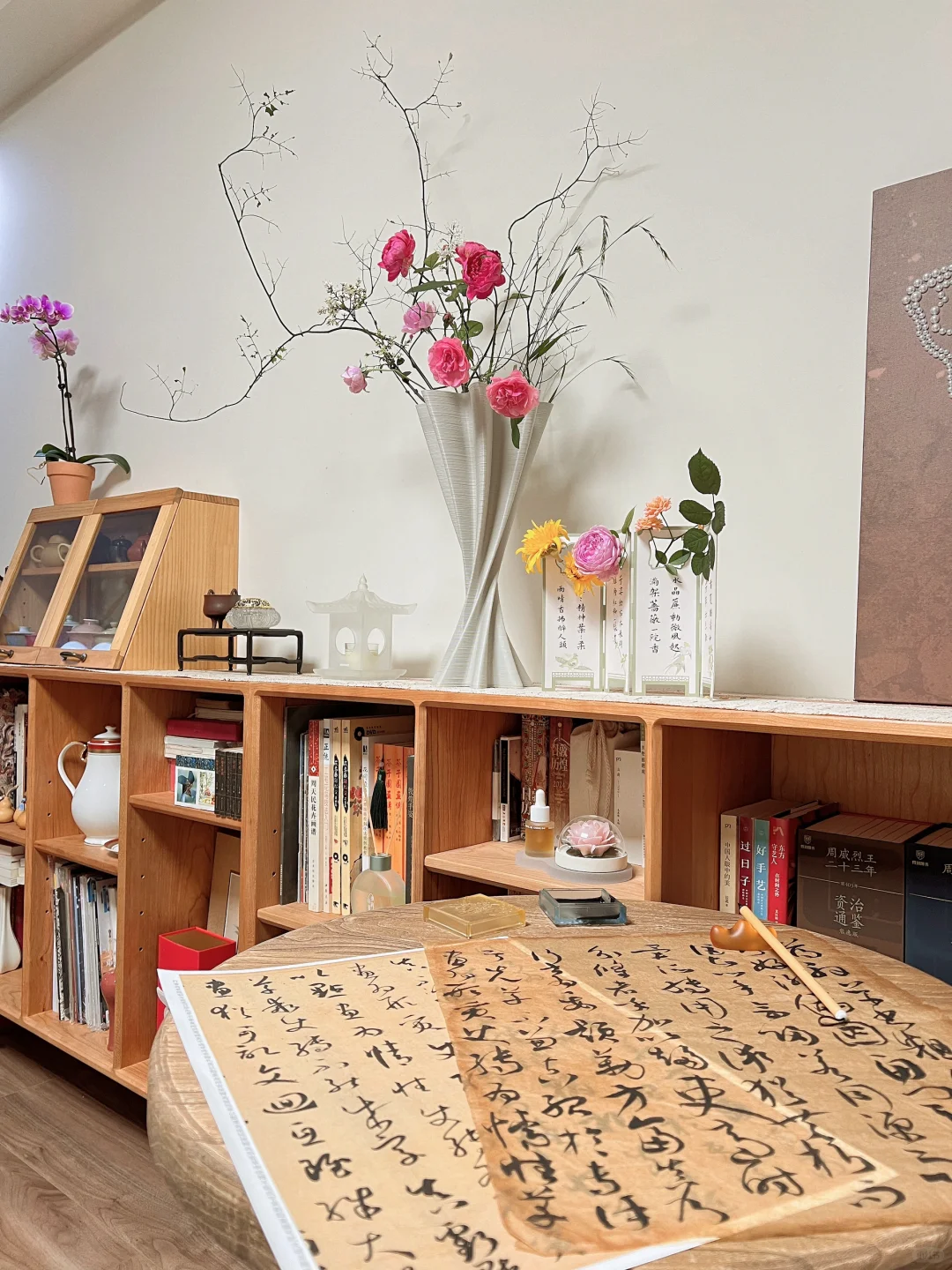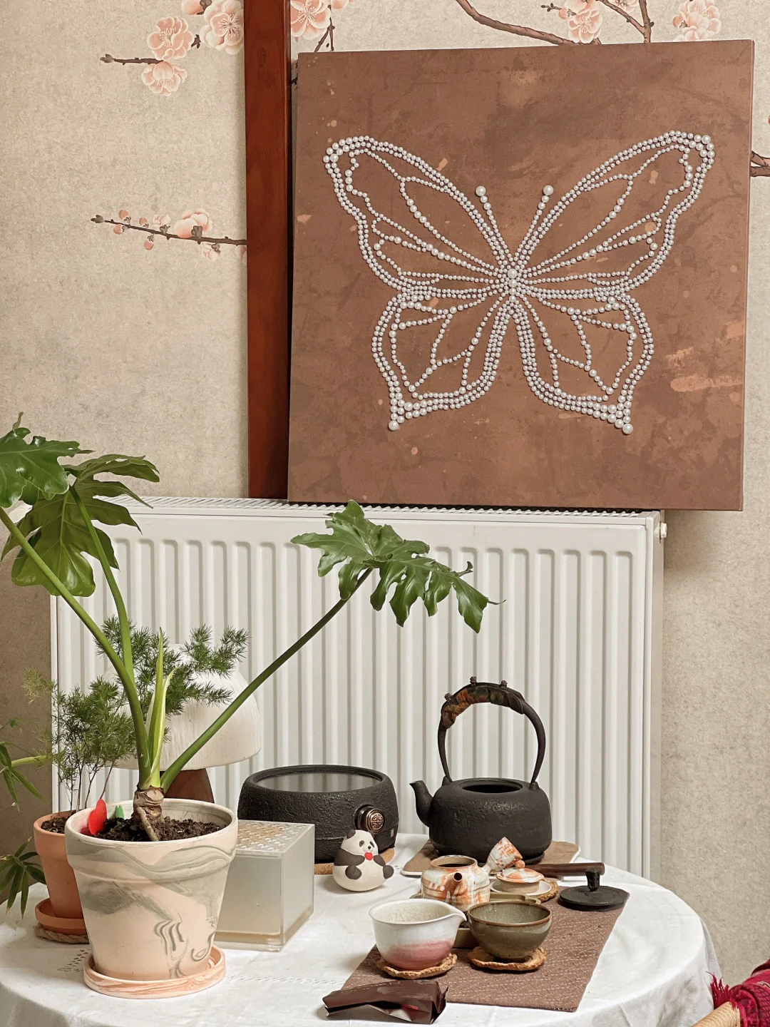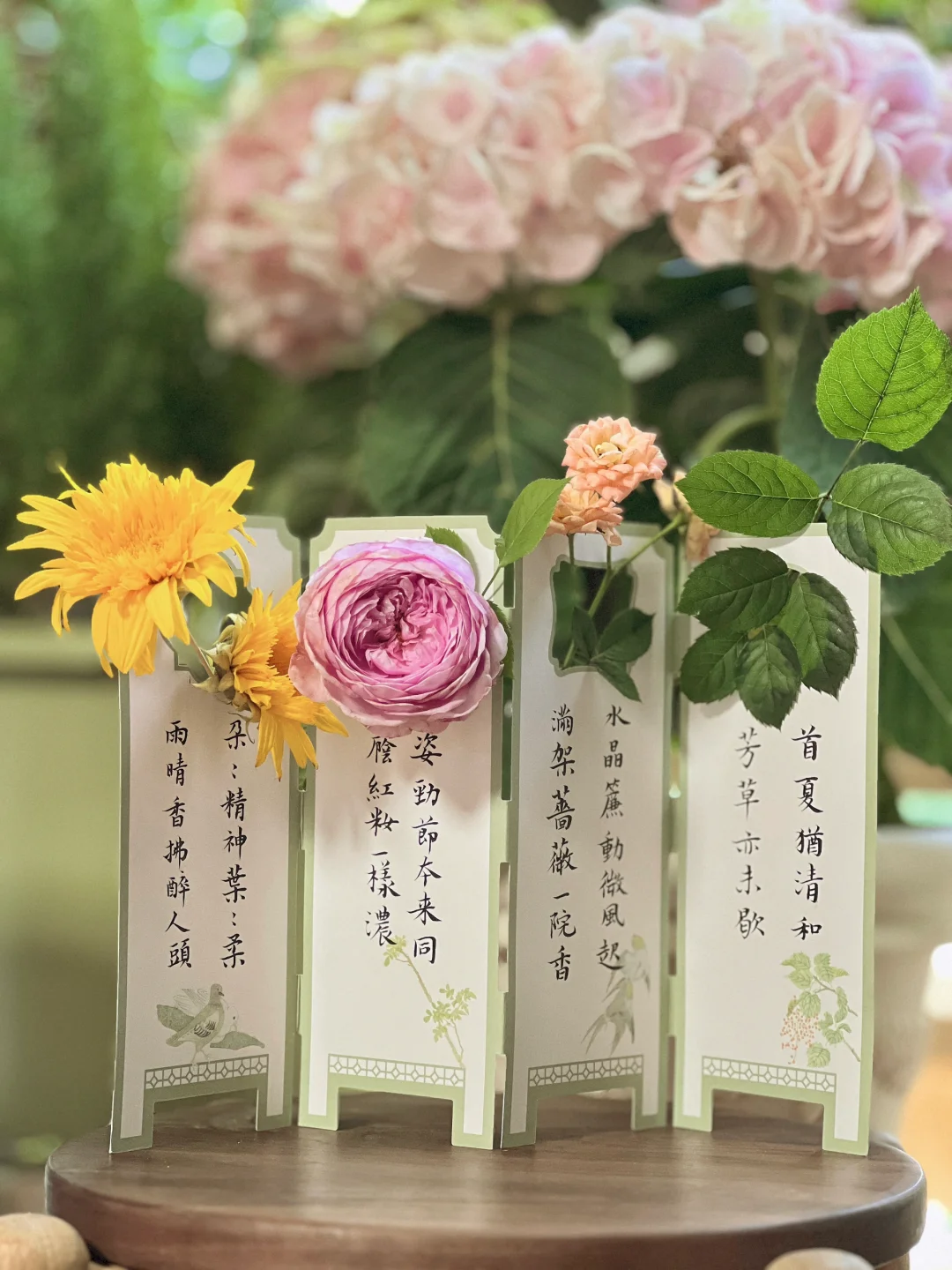 再搭配立体珍珠蝴蝶装饰画,手写花卉书法屏风,把夏天搬入了家里。
