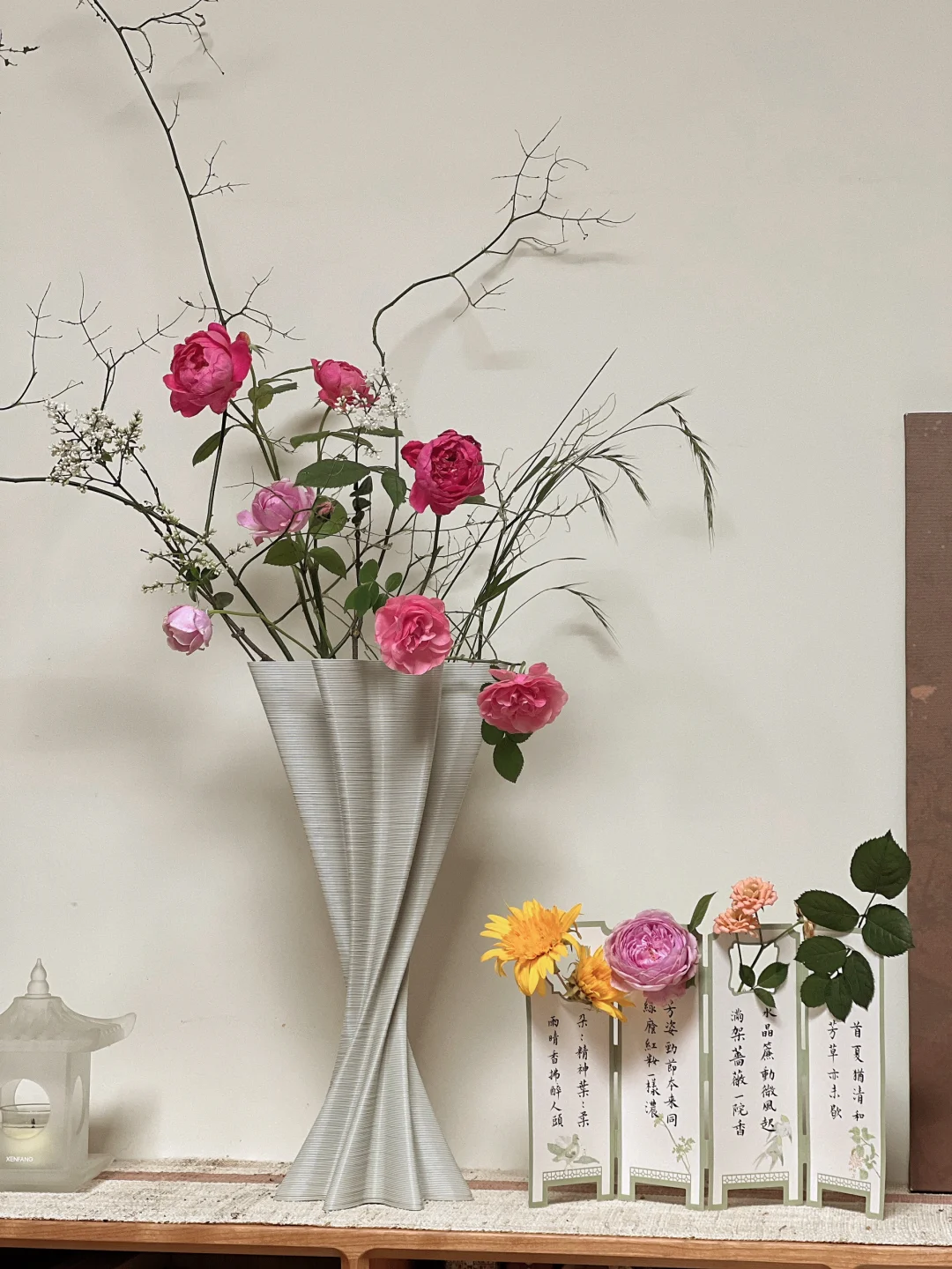 花朵形状的瓶口,轻松的塑造出手打螺旋的造型,简单几朵月季花,就做出一件灵动的艺术品。
