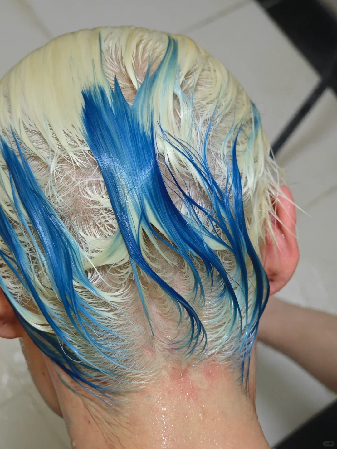 💙第一遍是用的我原來的,基本不疼,後面實在疼得不行,所以加起來一共就漂了三次,後面狼尾的藍色,因為不想染太深的顏色「也是臨時買的,顏色有點深,我原來常備的恰好都用完了」,所以染上去大約兩三分鐘就洗了,,第二天用了一點去黃洗髮水