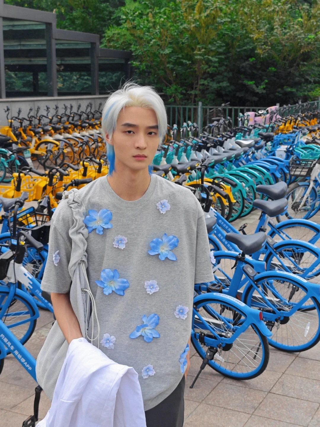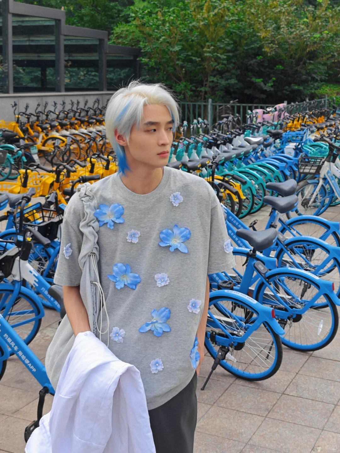 🔷一件釘滿卡特蘭的短袖 💙圖1、2、3前天早上在地鐵口拍的,停了很多藍色的單車 💙圖4、5、6手工染色花朵,每一片花瓣都是一筆一筆上色的「不會掉色」