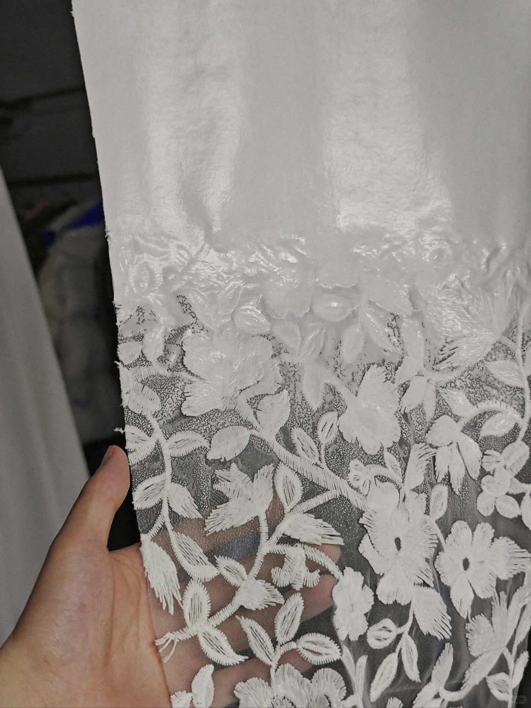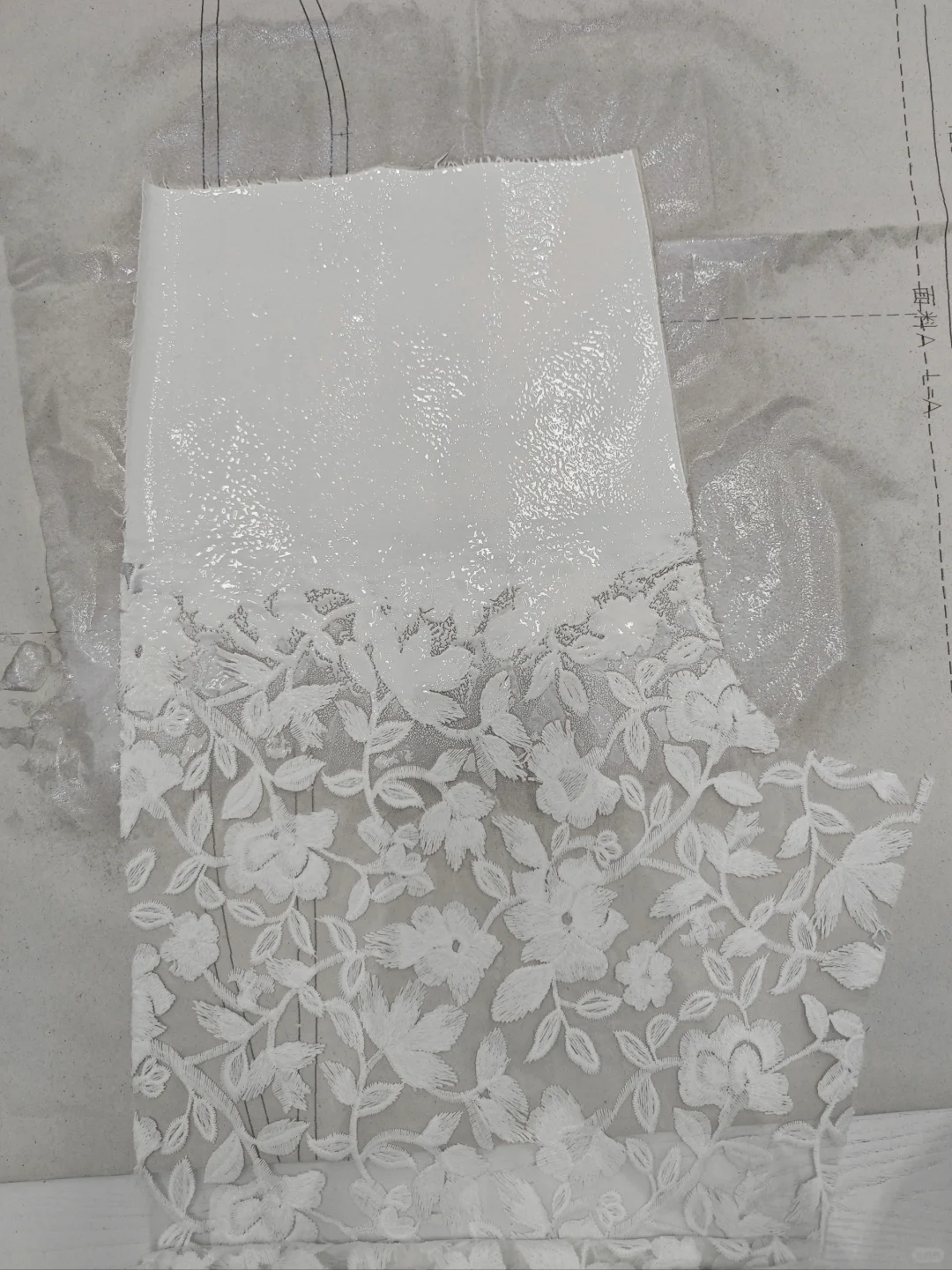 🔷通過的“造皮材料包”,我把蕾絲和“皮革”無縫拼接在了一起 💙圖4是調和好的打底漿、白色色漿和固化劑,如果需要噴塗的話,可以多次少量加水稀釋調和,我個人經驗,調和的越稀塗料就越容易攤平,晾乾後的質感越平滑,也就越不像皮,, 💙圖3,第二遍剛噴好的褲子裁片,我調和的沒那麼稀,加上噴槍的噴力,可以看到灑落的塗料堆積出的顆粒感的紋理,晾乾後又復噴了兩次 🤍PS:我還嘗試了羊毛、牛仔、麂皮絨面料等,會有不同效果,後續會分享出來