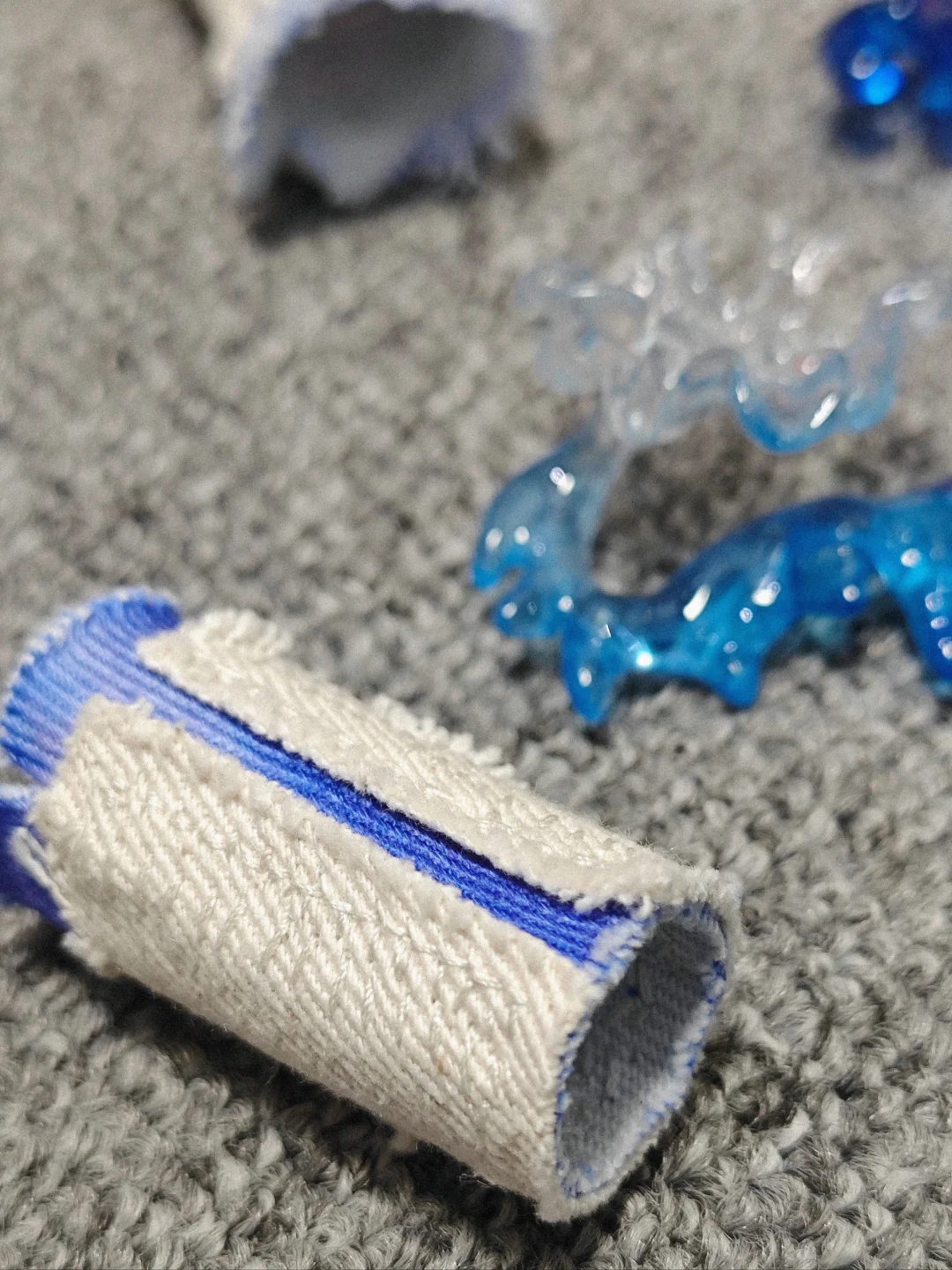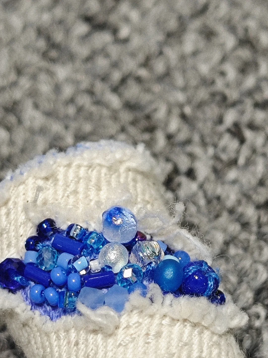 🔷美麗的傷痕 💙用邊角料和各種珠子「從我上學時期到現在一直收集的」,布料剪的斜絲,加上布料本身微彈,使得包容度更高一些,