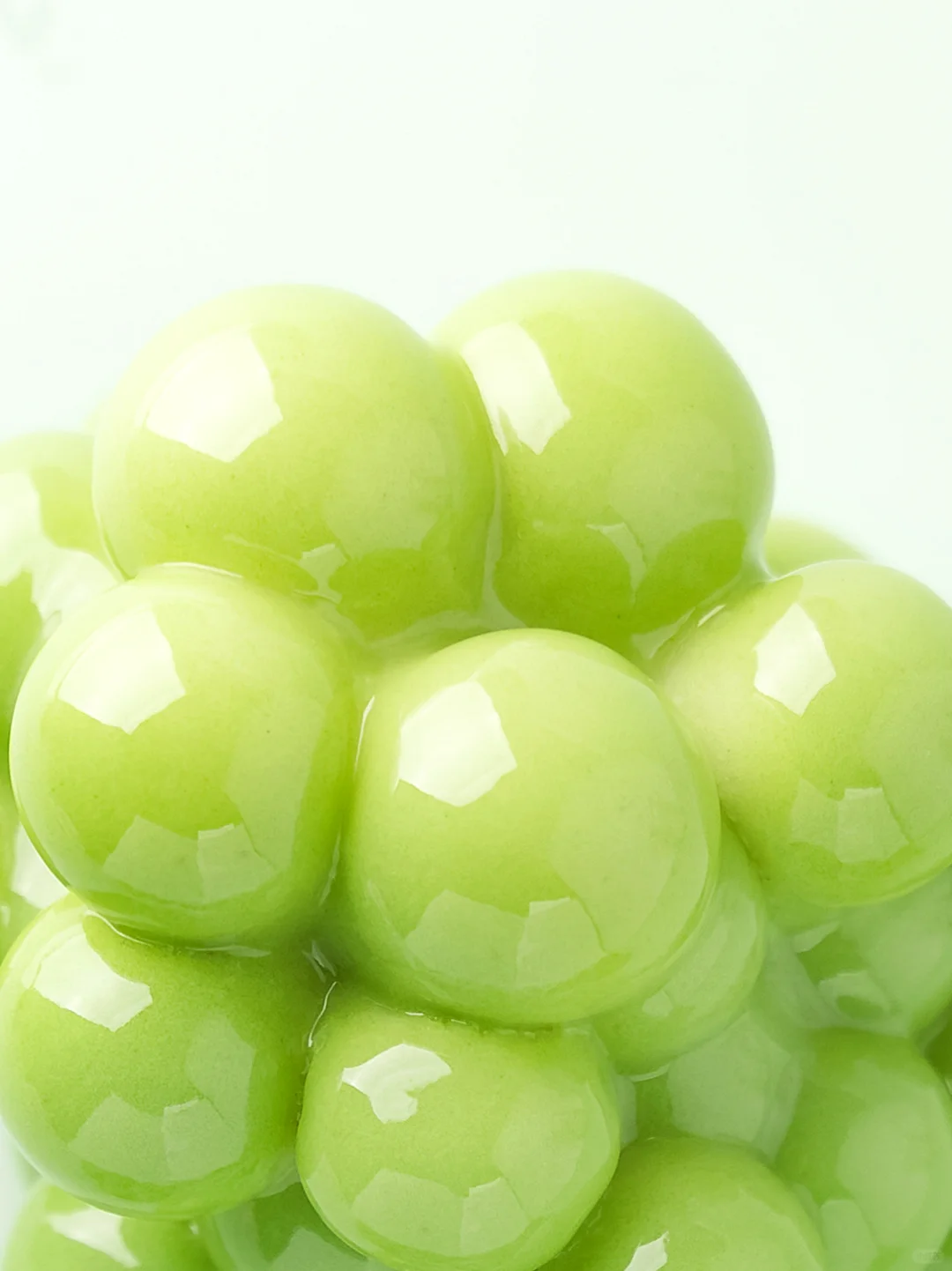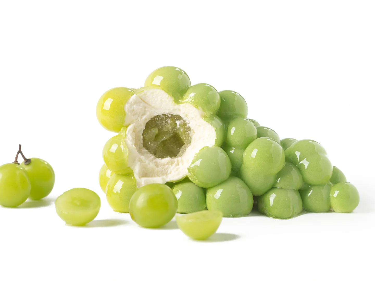 3、加入新鲜青提果肉搅匀,注入15连圆球模具中冷冻冻硬。
