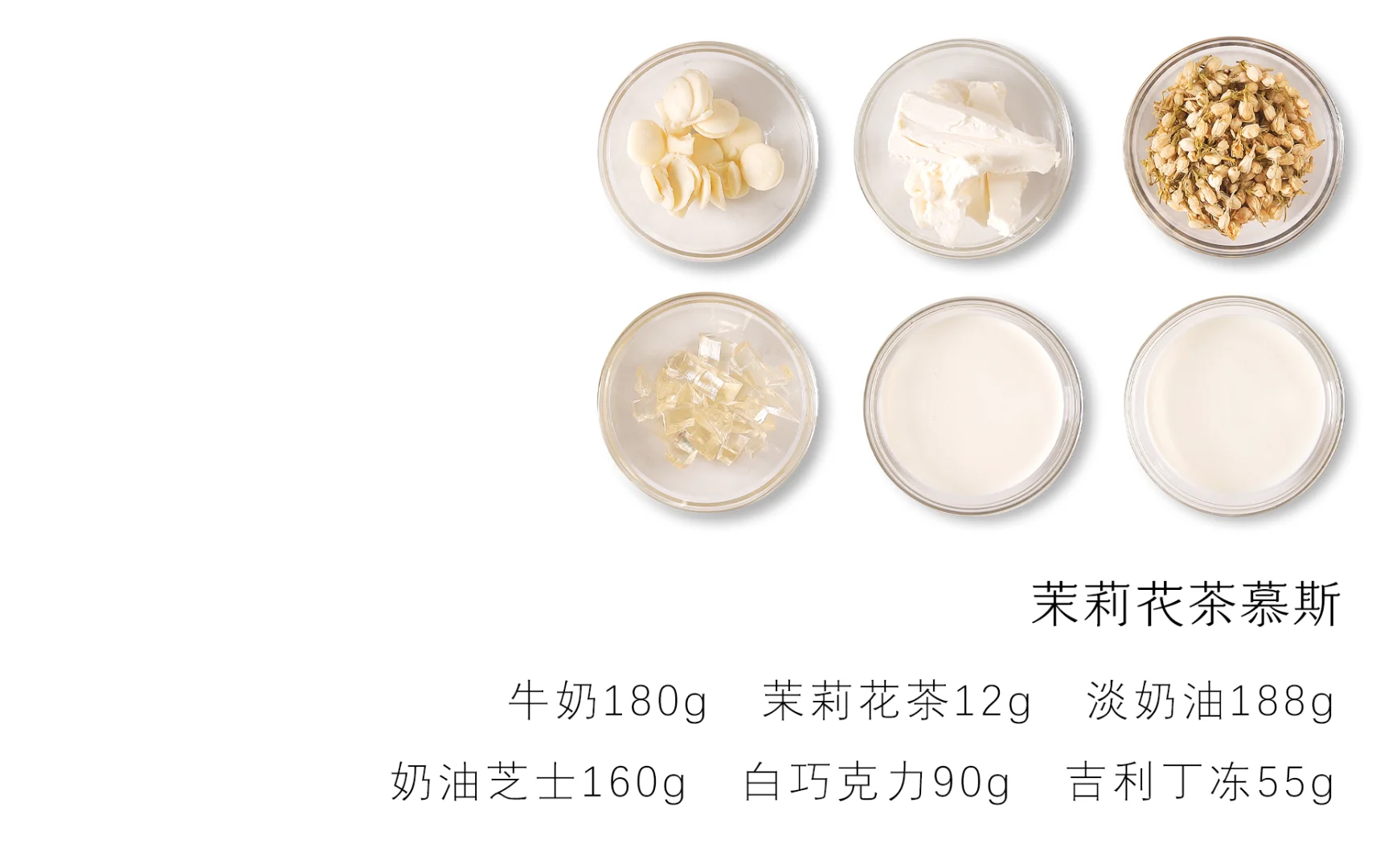 1、牛奶加热煮沸,加入茉莉花茶浸泡,保鲜膜密封萃取风味10分钟,过滤掉茉莉花,补全牛奶的重量至160g。