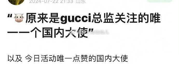 张凌赫是Gucci总监关注的唯一一个国内大使,昨天活动也只给他点赞了[干饭人][干饭人][干饭人]