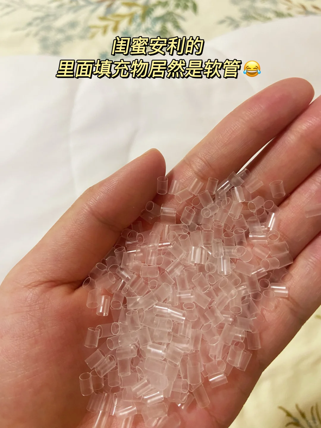 后来闺蜜换了一个枕头,按头安利给我,拿到手我惊了。里面的填充物居然是这些细小的软管😂
