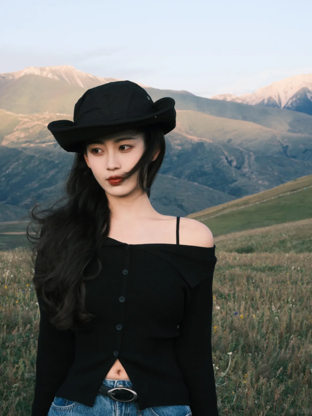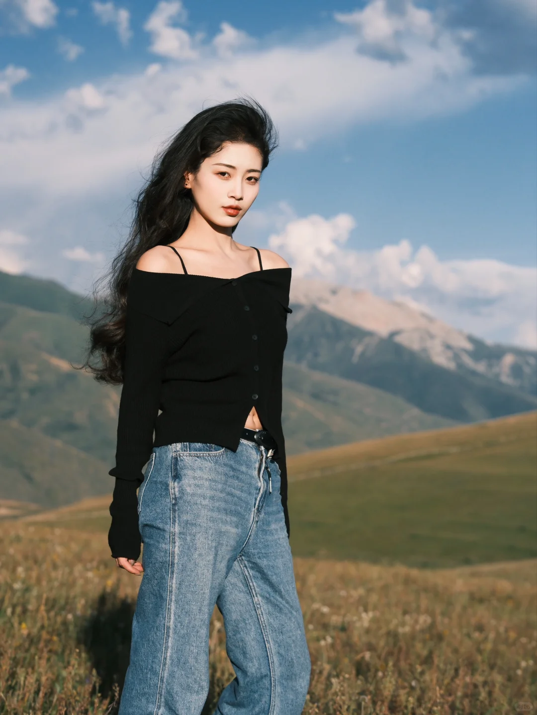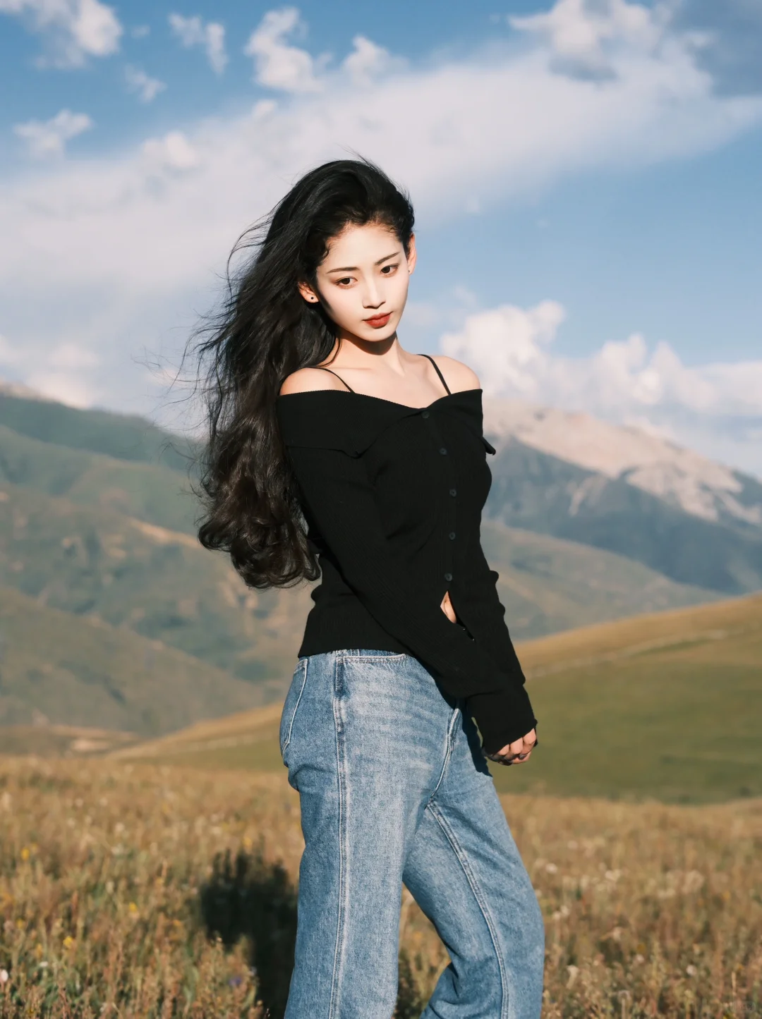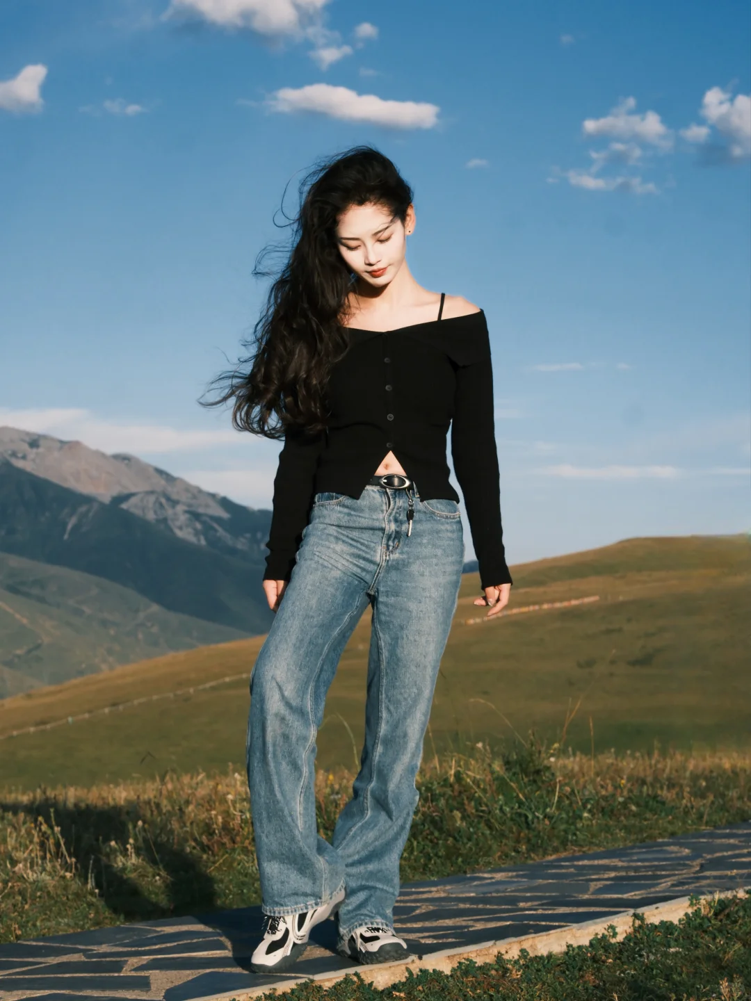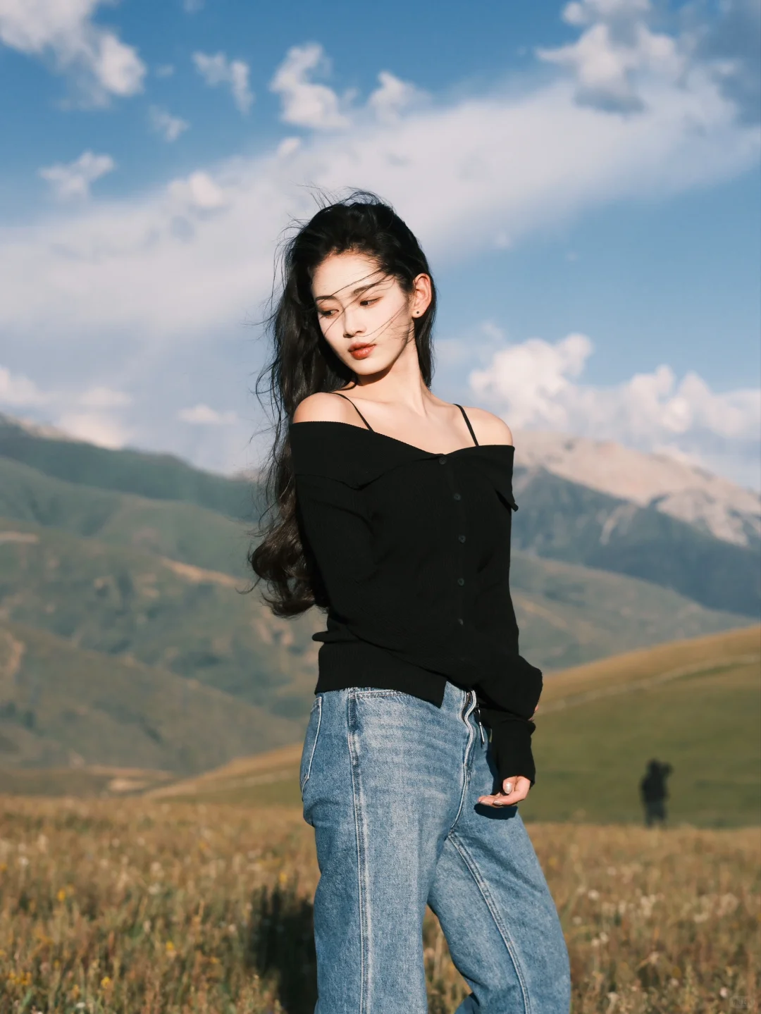 一字肩+ 宽松直筒牛仔裤