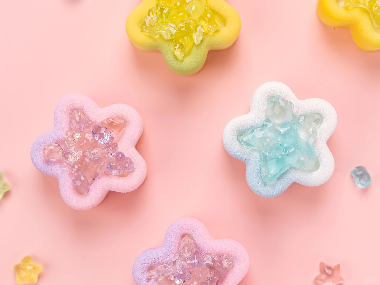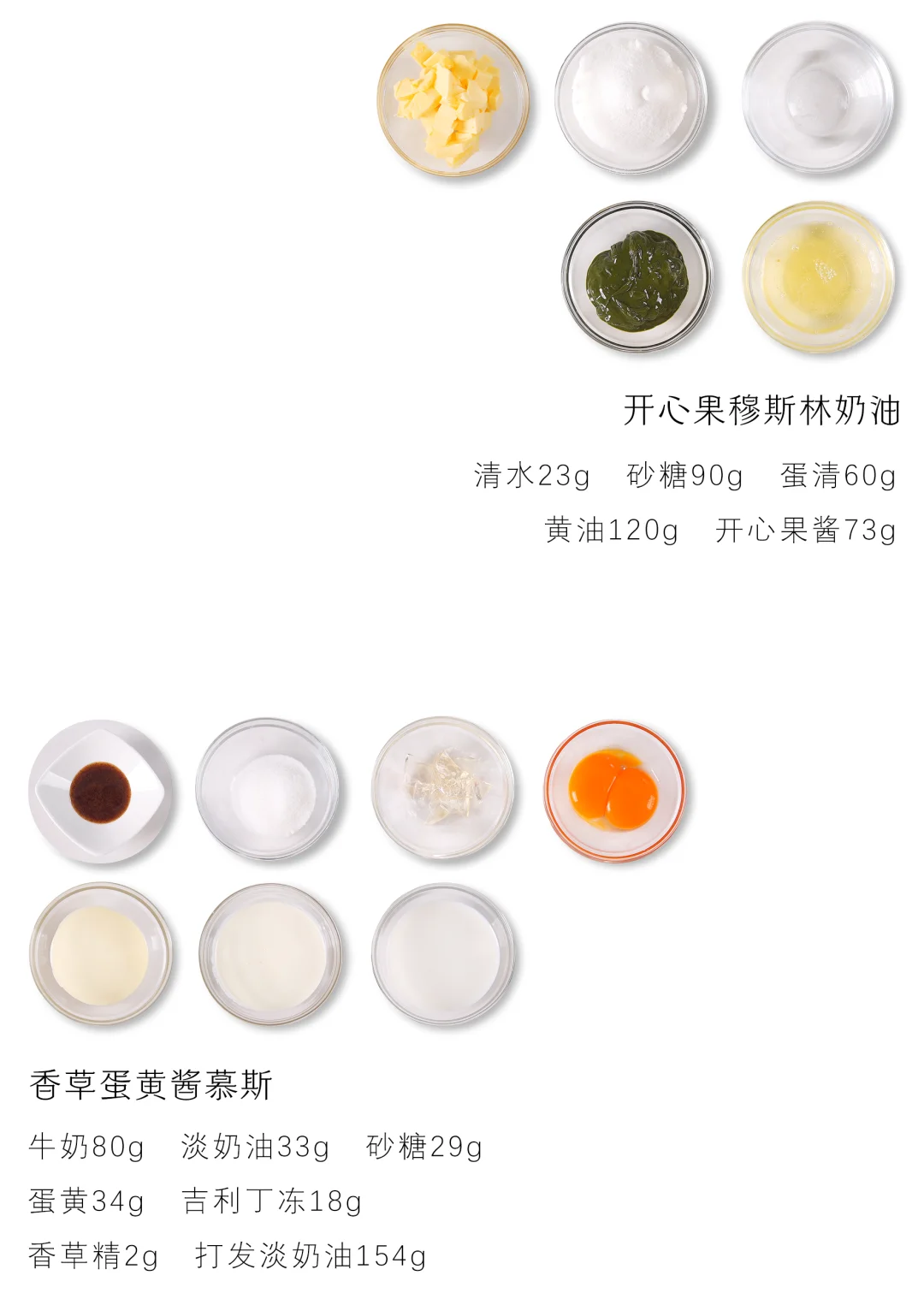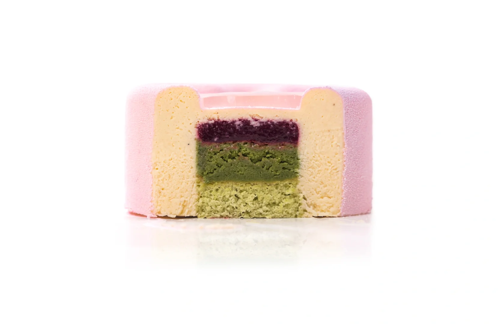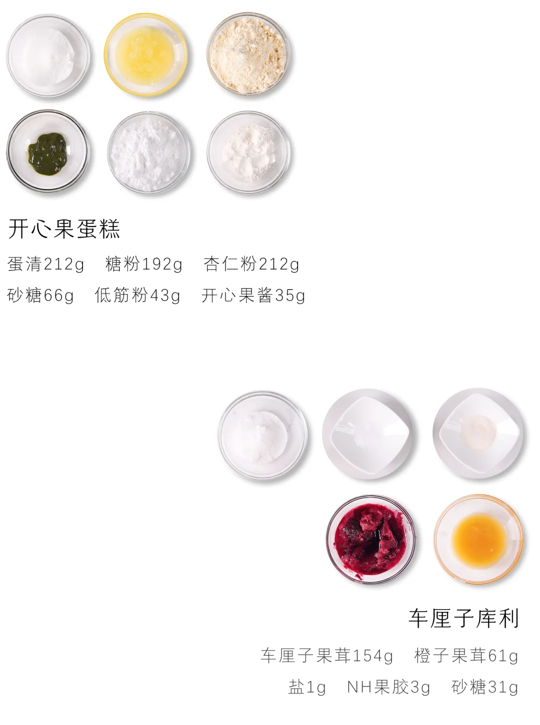 . 🌟今天分享一款多巴胺色系的慕斯蛋糕,一闪一闪亮晶晶✨ . 🌟配方看图上哦 . 🌟制作要点 1⃣️ 开心果蛋糕 1、糖粉、杏仁粉和过筛的低筋粉混合搅匀。 2、砂糖分次加入到蛋清中打发蛋白霜,打发至呈尖钩状,分次加入步骤1的粉类翻拌均匀。 3、取少量面糊与开心果酱搅匀,再倒回到剩下的面糊中翻拌均匀。 4、抹平至约0.6cm厚度,平炉上下火190°C烤制9-11分钟,出炉冷却后用挞圈刻印成直径18cm的圆片。 . 2⃣️ 车厘子橙子库利制作 1、车厘子果茸和橙子果茸搅拌加热至40°C,加入提前拌匀的NH果胶和砂糖,快速搅拌煮至沸腾,加入盐搅匀离火。 2、倒在保鲜膜封底、侧边围玻璃纸的挞圈(直径18cm)中约至1cm厚度后冷冻冻硬。 . 3⃣️ 开心果穆斯林奶油 1、室温软化的黄油打发至蓬松状,加入开心果酱搅打均匀。 2、清水和砂糖混合加热,煮至110°C时开始打发蛋清,糖液煮至118°C离火慢慢倒入到打发的蛋清中继续打发至室温,分次加入到步骤1中翻拌均匀。 3、倒在库利上抹平至约1cm厚度,再放上蛋糕后冷冻冻硬。 . 4⃣️ 香草蛋黄酱慕斯 1、砂糖和蛋黄搅拌均匀。 2、牛奶和淡奶油混合加热煮沸,慢慢倒入步骤1的蛋黄部分中搅匀,再倒回锅中,加入香草香精,继续中小火加热煮至83°C离火,加入吉利丁冻融化均匀,整体均匀过筛。 3、降温至28°C后,加入打发至5-6成的淡奶油翻拌均匀。 . 5⃣️ 艾素糖 1、取适量艾素糖加热至165°C融化成透明糖液,取少量粉色水溶色粉溶解到少量饮用水中调成粉色,蘸取适量到艾素糖液中调成淡粉色,冷却凝固后敲碎成小块。(其他颜色的艾素糖制作同上)。 2、在星星模具凹陷处放入粉紫艾素糖,用火枪燎至透亮,冷却后取出备用。 . 6⃣️ 成品组装 1、冻硬的夹心蛋糕部分脱模,用星星刻模(直径6cm)刻印出形状备用。 2、将慕斯液注入6连凹星星模具中,进行挂壁操作后填补适量慕斯液,放入夹心部分,抹平后冷冻冻硬。 3、慕斯脱模后,整体均匀喷涂粉色喷砂液,再局部喷涂紫色形成渐变,上色温度为35-40°C。这里3款星星一共使用到的色粉为sevarome油溶色粉白色、粉色、蓝色、黄色、绿色。 4、在凹陷处裱挤浅浅一层镜面果胶,再组装上星星艾素糖部分即可。 .