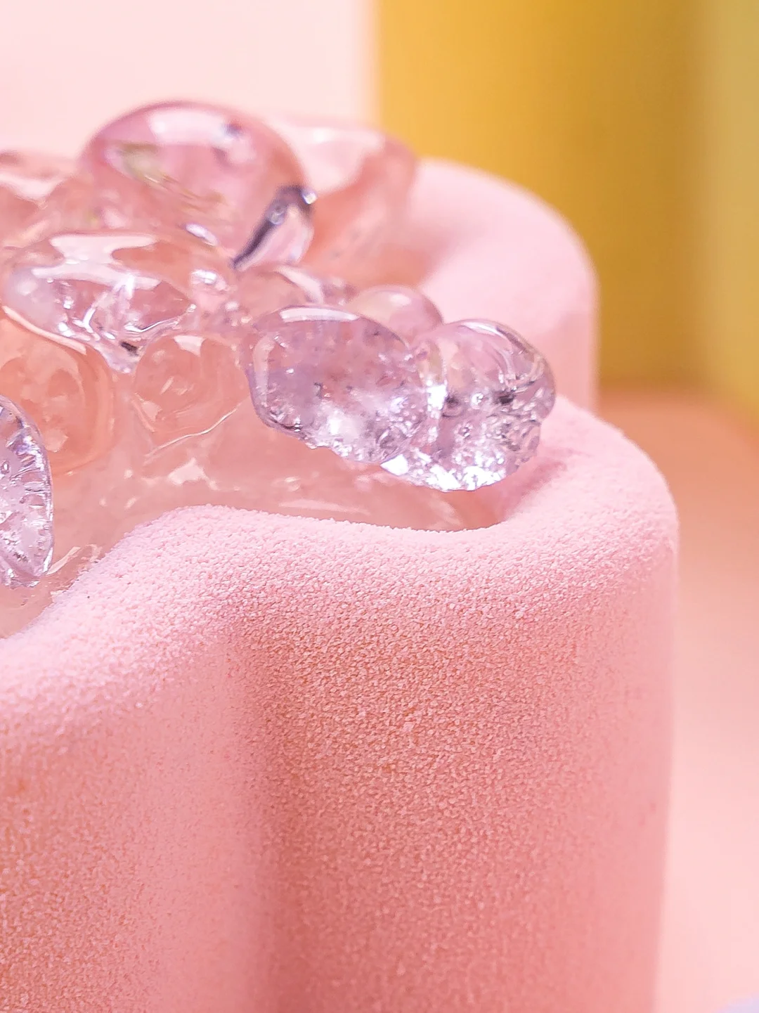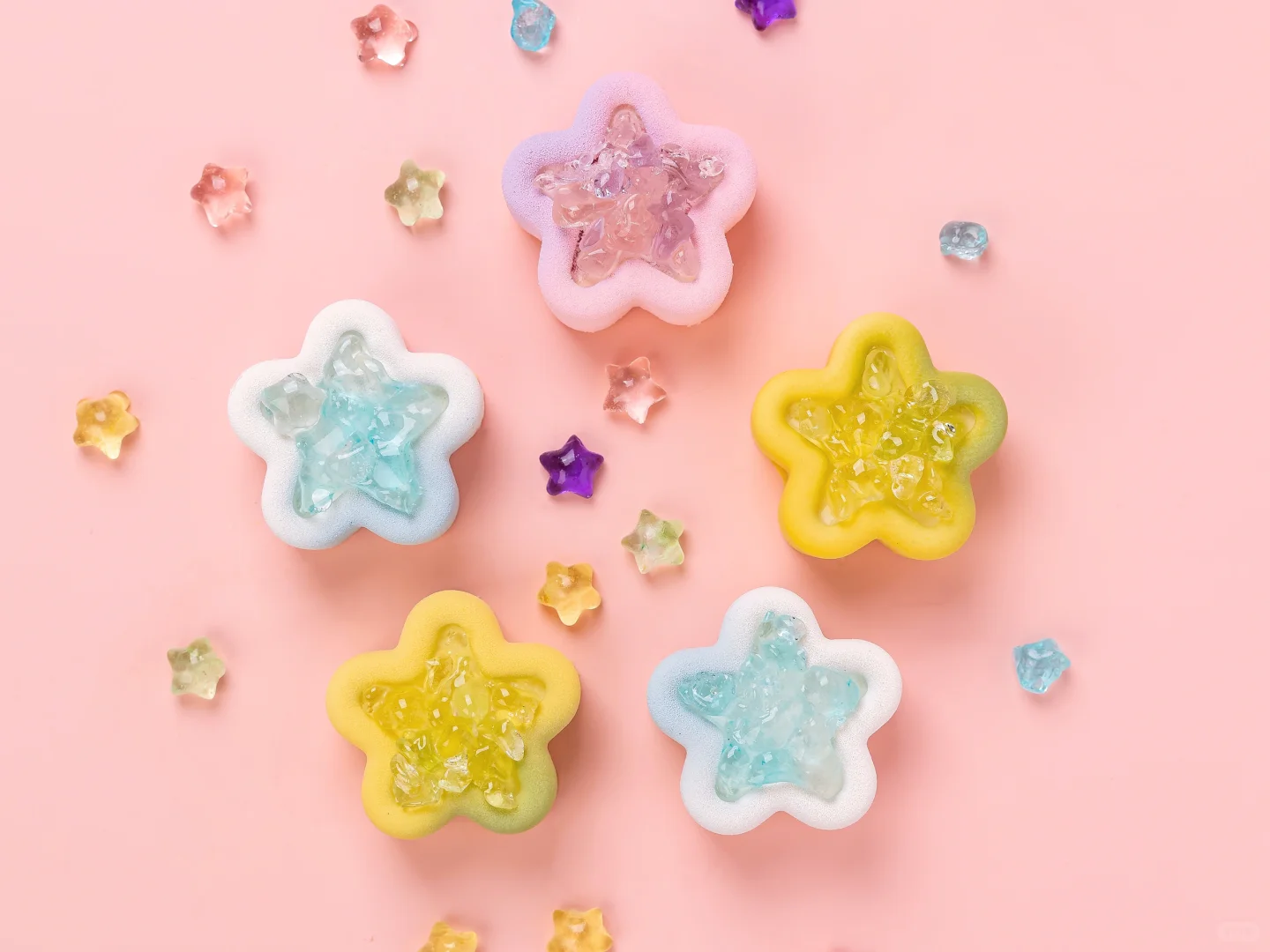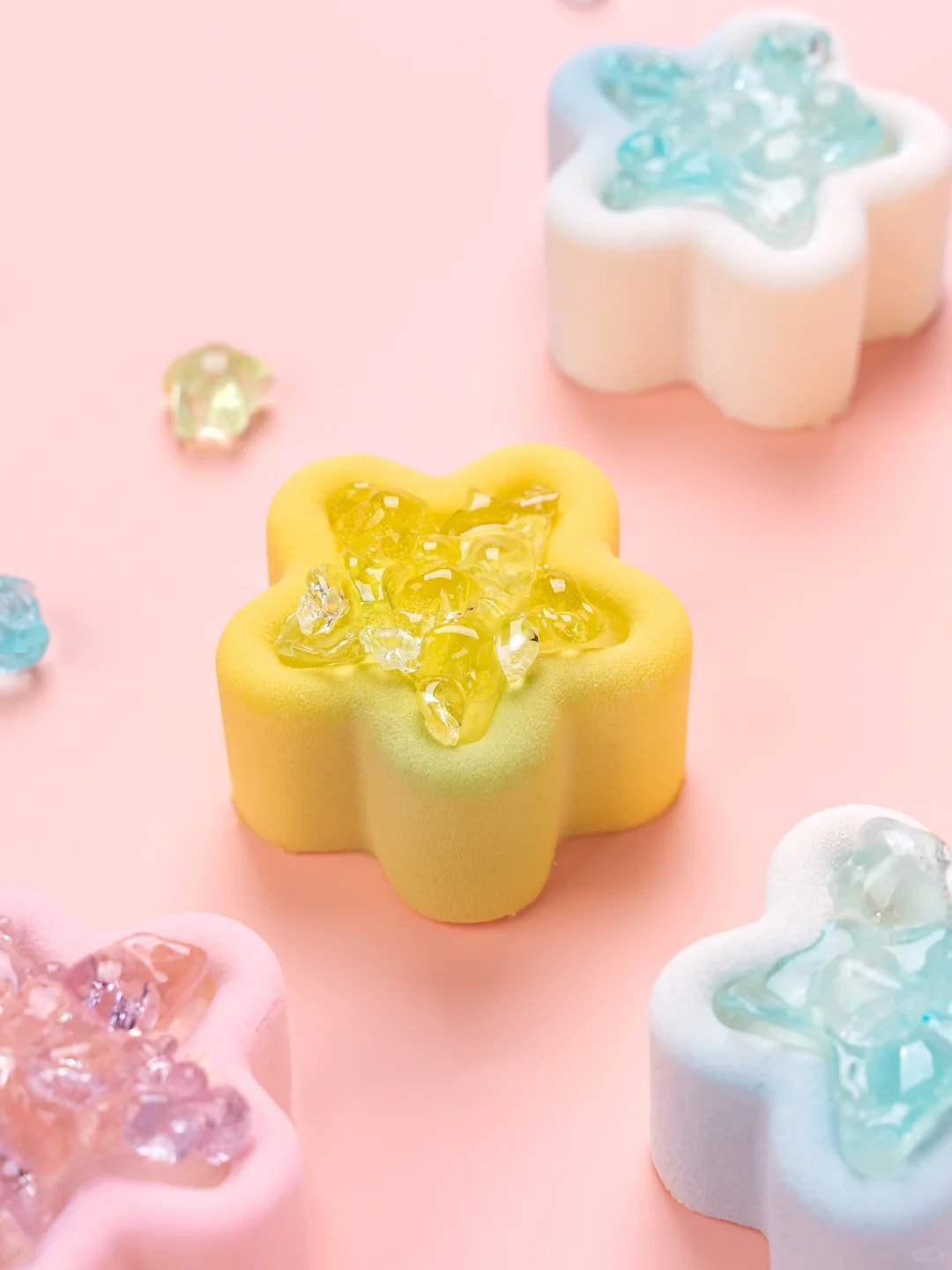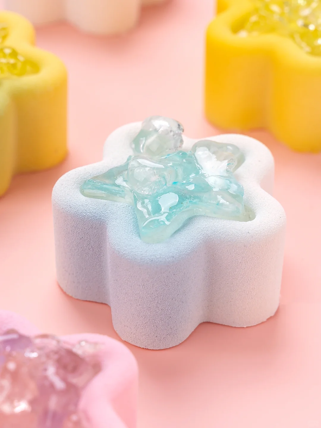 . 🌟今天分享一款多巴胺色系的慕斯蛋糕,一闪一闪亮晶晶✨ . 🌟配方看图上哦 . 🌟制作要点 1⃣️ 开心果蛋糕 1、糖粉、杏仁粉和过筛的低筋粉混合搅匀。 2、砂糖分次加入到蛋清中打发蛋白霜,打发至呈尖钩状,分次加入步骤1的粉类翻拌均匀。 3、取少量面糊与开心果酱搅匀,再倒回到剩下的面糊中翻拌均匀。 4、抹平至约0.6cm厚度,平炉上下火190°C烤制9-11分钟,出炉冷却后用挞圈刻印成直径18cm的圆片。 . 2⃣️ 车厘子橙子库利制作 1、车厘子果茸和橙子果茸搅拌加热至40°C,加入提前拌匀的NH果胶和砂糖,快速搅拌煮至沸腾,加入盐搅匀离火。 2、倒在保鲜膜封底、侧边围玻璃纸的挞圈(直径18cm)中约至1cm厚度后冷冻冻硬。 . 3⃣️ 开心果穆斯林奶油 1、室温软化的黄油打发至蓬松状,加入开心果酱搅打均匀。 2、清水和砂糖混合加热,煮至110°C时开始打发蛋清,糖液煮至118°C离火慢慢倒入到打发的蛋清中继续打发至室温,分次加入到步骤1中翻拌均匀。 3、倒在库利上抹平至约1cm厚度,再放上蛋糕后冷冻冻硬。 . 4⃣️ 香草蛋黄酱慕斯 1、砂糖和蛋黄搅拌均匀。 2、牛奶和淡奶油混合加热煮沸,慢慢倒入步骤1的蛋黄部分中搅匀,再倒回锅中,加入香草香精,继续中小火加热煮至83°C离火,加入吉利丁冻融化均匀,整体均匀过筛。 3、降温至28°C后,加入打发至5-6成的淡奶油翻拌均匀。 . 5⃣️ 艾素糖 1、取适量艾素糖加热至165°C融化成透明糖液,取少量粉色水溶色粉溶解到少量饮用水中调成粉色,蘸取适量到艾素糖液中调成淡粉色,冷却凝固后敲碎成小块。(其他颜色的艾素糖制作同上)。 2、在星星模具凹陷处放入粉紫艾素糖,用火枪燎至透亮,冷却后取出备用。 . 6⃣️ 成品组装 1、冻硬的夹心蛋糕部分脱模,用星星刻模(直径6cm)刻印出形状备用。 2、将慕斯液注入6连凹星星模具中,进行挂壁操作后填补适量慕斯液,放入夹心部分,抹平后冷冻冻硬。 3、慕斯脱模后,整体均匀喷涂粉色喷砂液,再局部喷涂紫色形成渐变,上色温度为35-40°C。这里3款星星一共使用到的色粉为sevarome油溶色粉白色、粉色、蓝色、黄色、绿色。 4、在凹陷处裱挤浅浅一层镜面果胶,再组装上星星艾素糖部分即可。 .