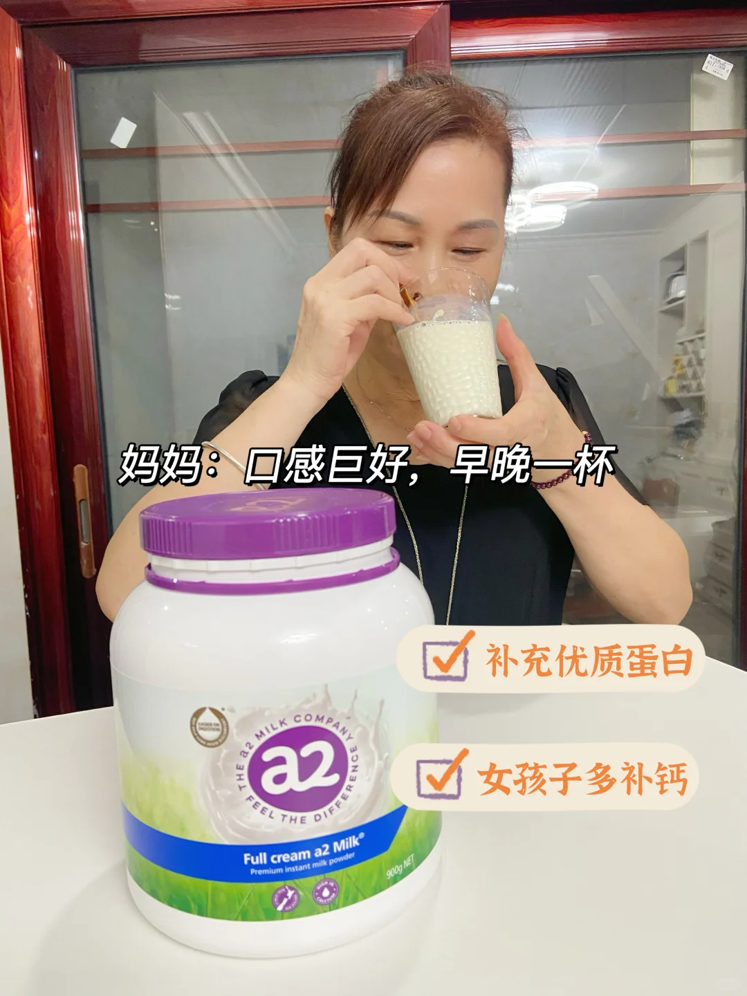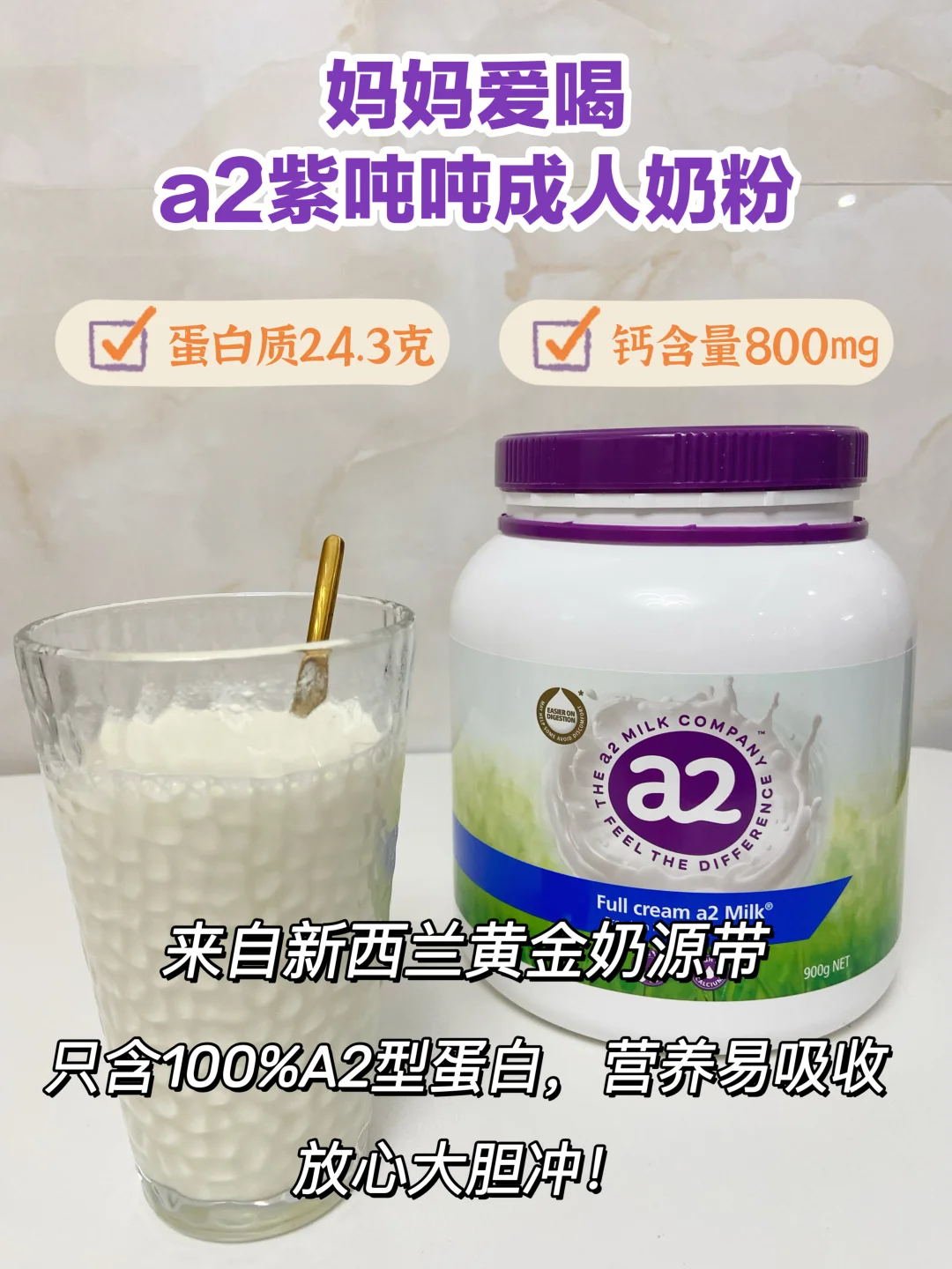 3️⃣补充优质蛋白和钙。妈妈早晚必喝a2紫吨吨成人奶粉,经常跳舞伤膝盖,所以她说一定要多补钙。a2紫吨吨成人奶粉,来自新西兰黄金奶源带,只含100%A2型蛋白,营养易吸收,每100g奶粉有24.3g蛋白质和800mg的钙,我妈不愧是讲究人啊。这次中秋我就给她安排了a2紫吨吨成人奶粉礼盒🎁她一定满意哈哈。
