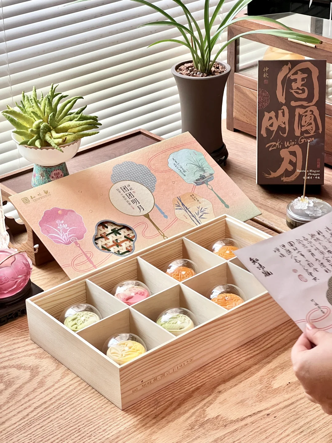 精美的梅兰竹松图案,六味八饼。有普洱茶、老白茶、奇亚籽的国风口味,还有橙味、松露、原味三种奶黄流心月饼。