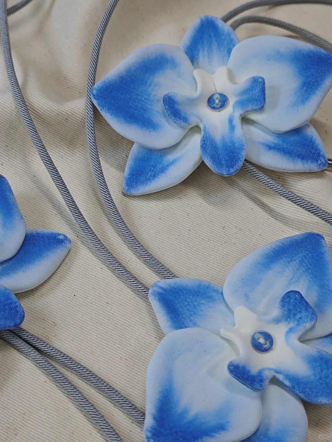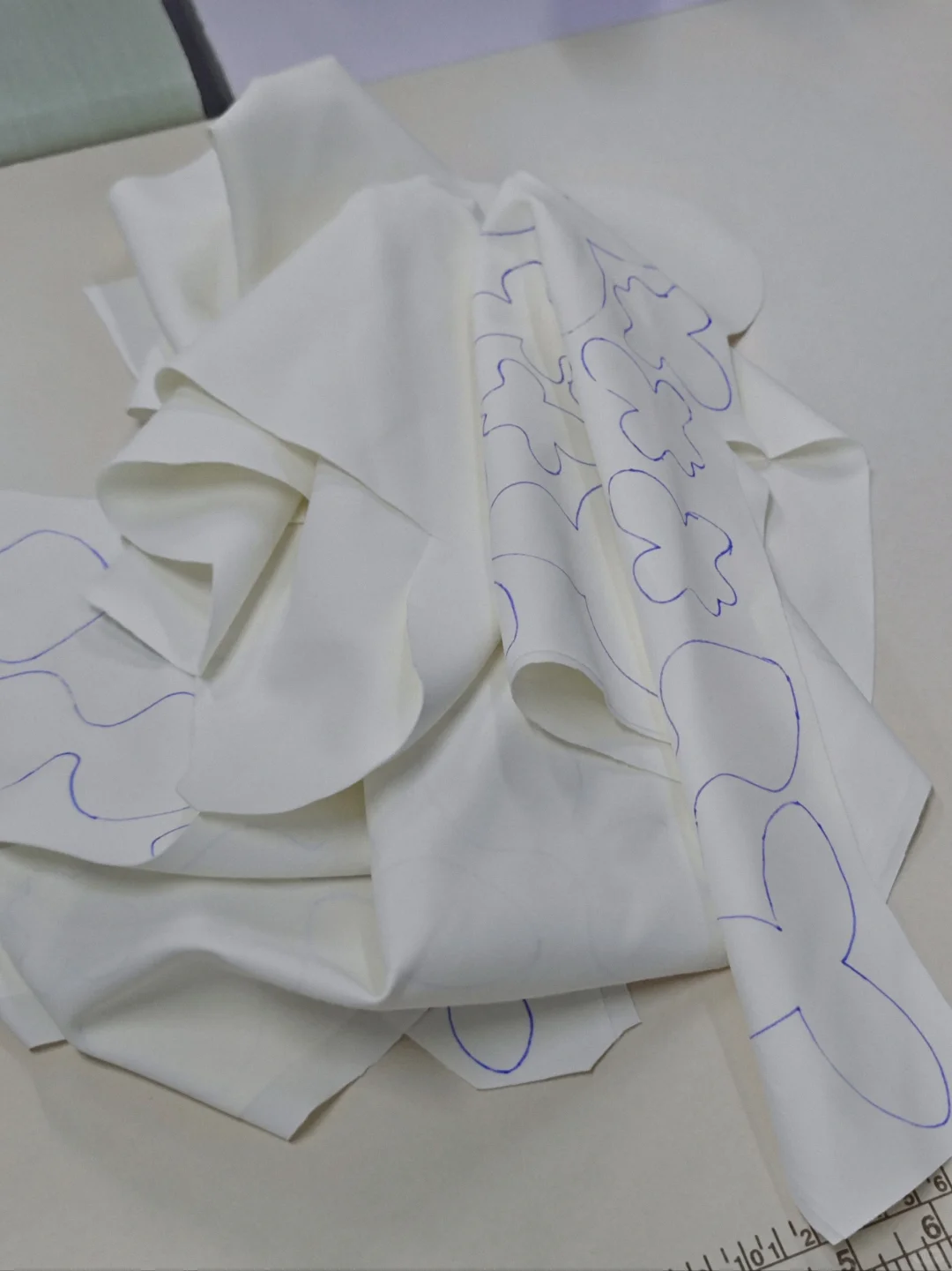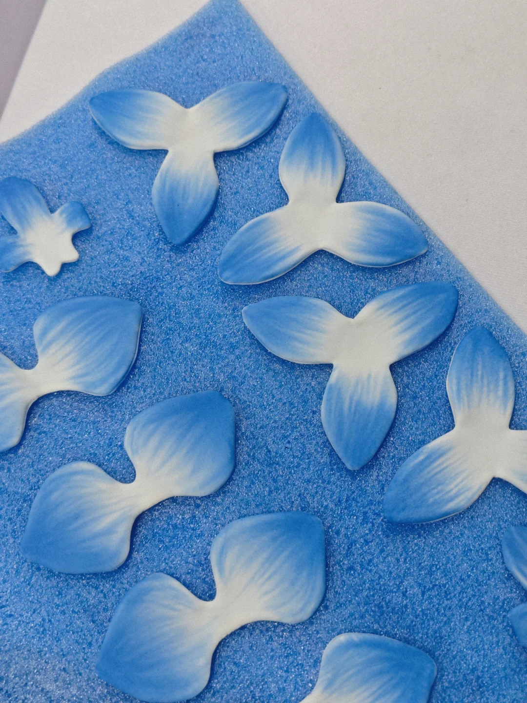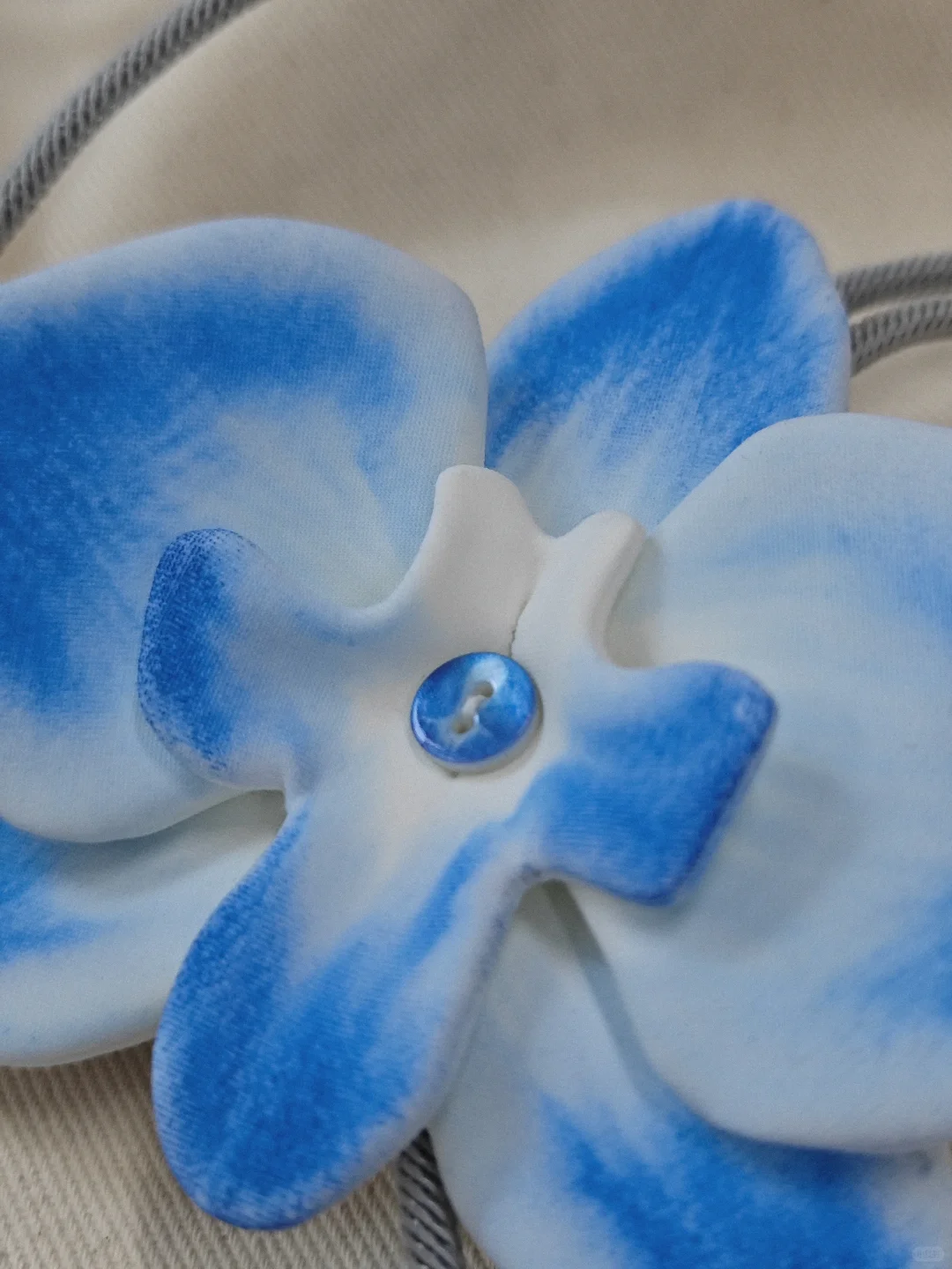 🔷用邊角料做了一些花 💙圖3花心的紐扣圖案和我小紅書頭像一樣,材質是貝殼的 💙圖4是剛上完色,帶有筆觸的顏色還沒有自然暈開 💙圖5是一些邊角料,上面用氣消失筆勾勒了蝴蝶蘭的花瓣,,等待被縫紉裁剪