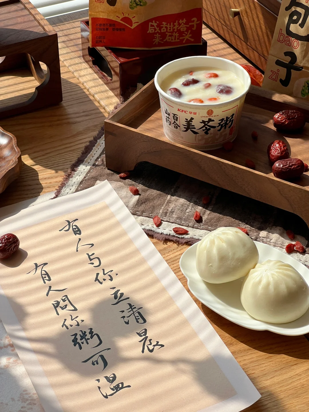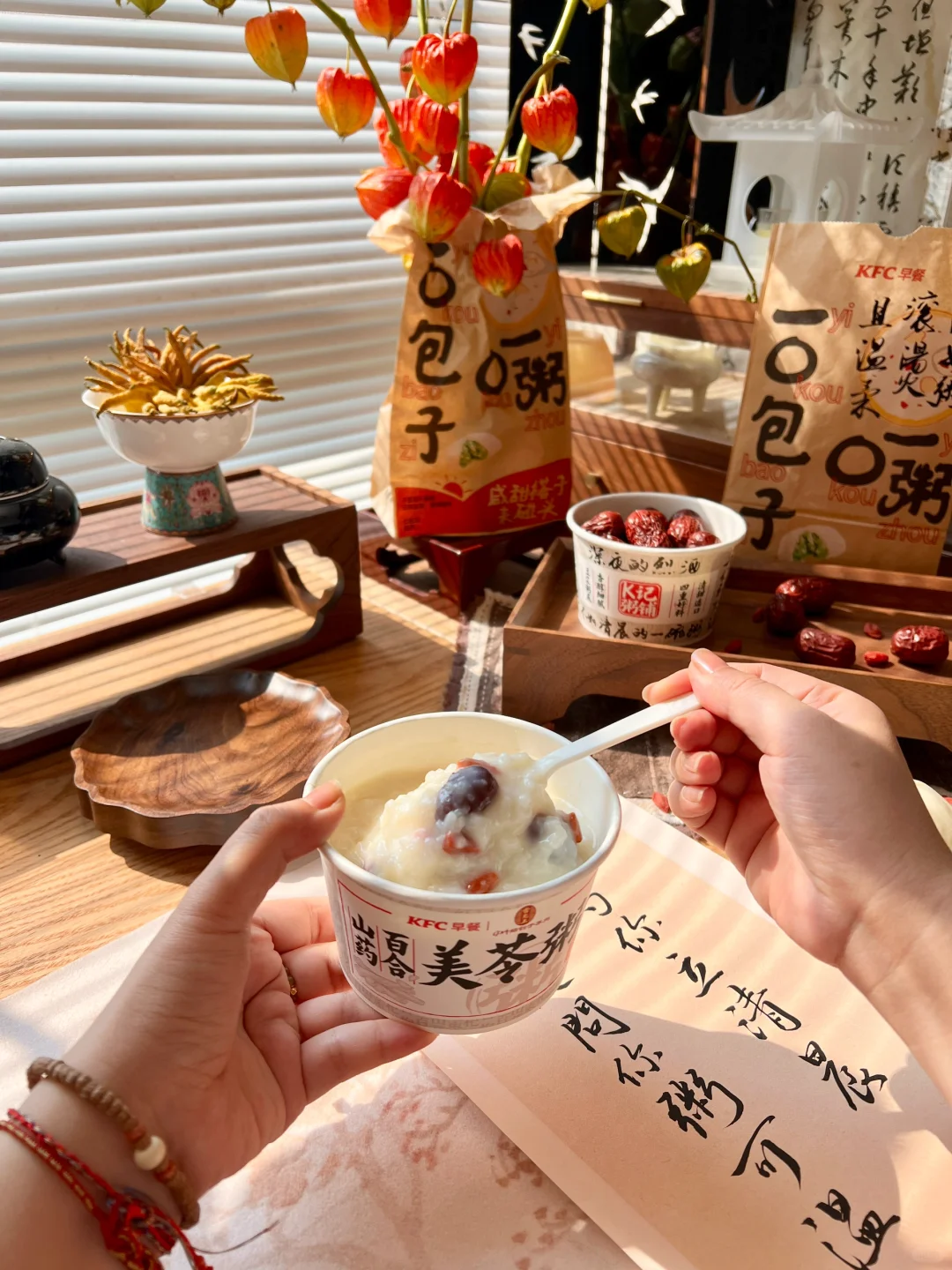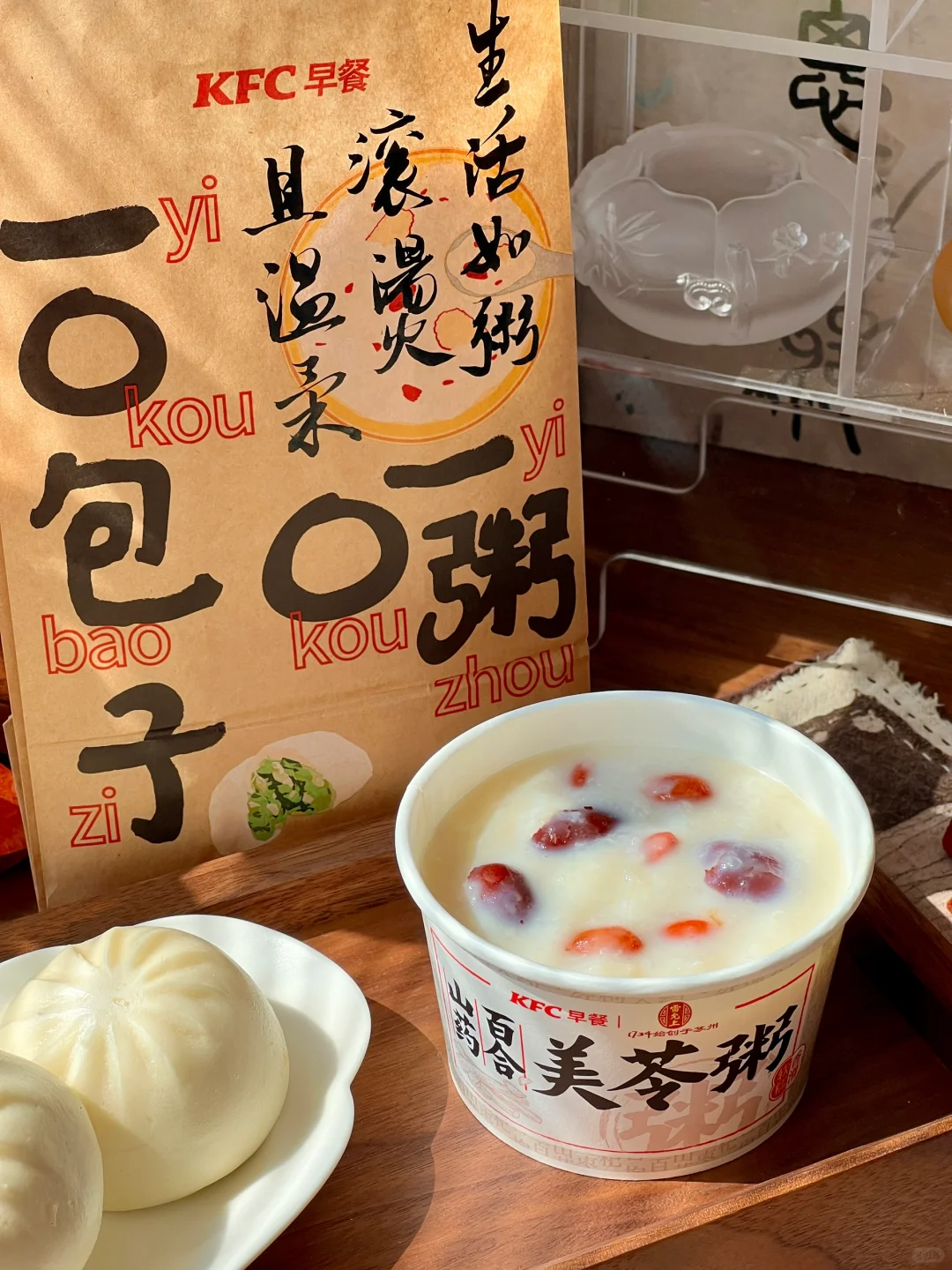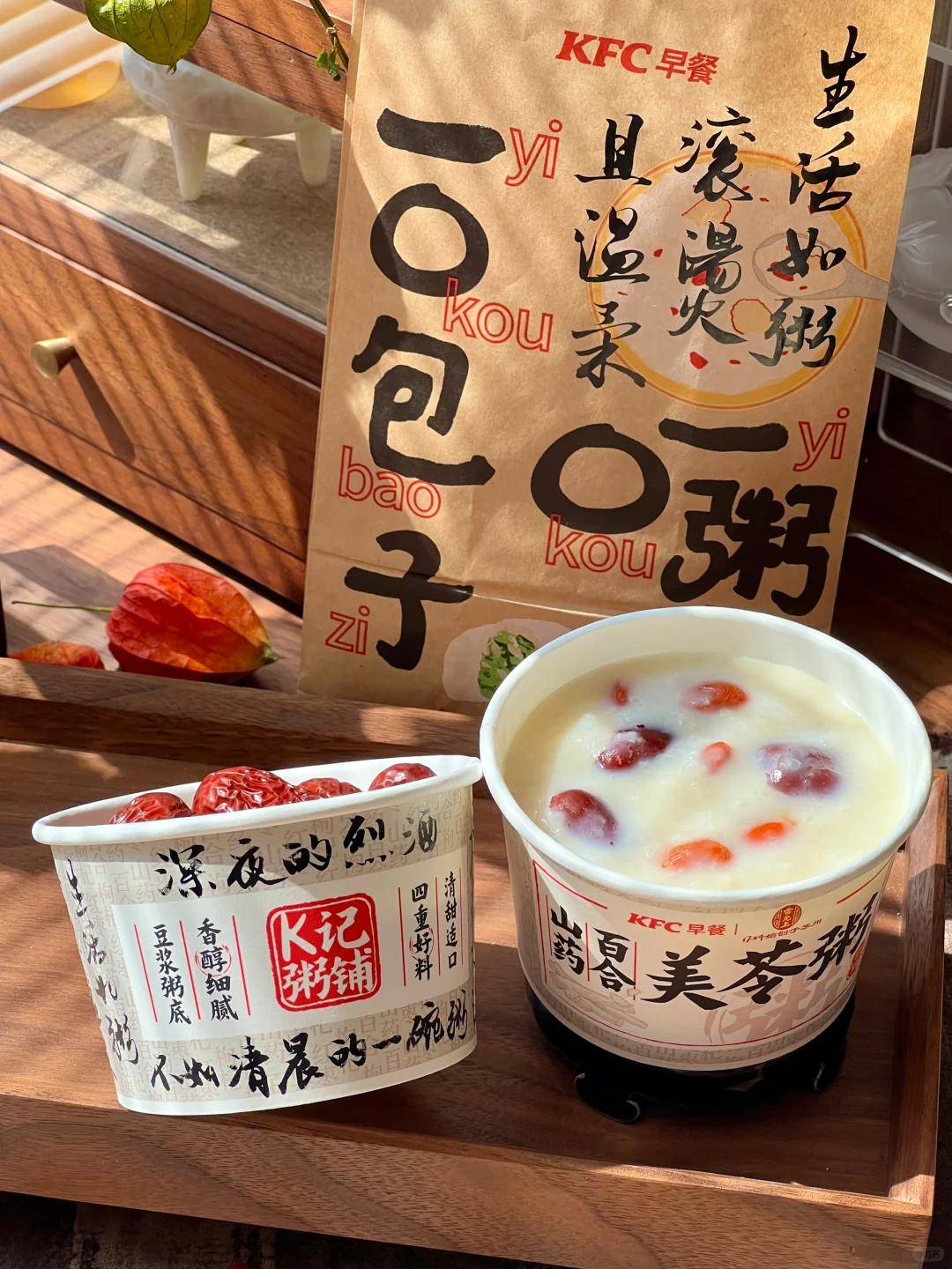 今天吃了肯德基早餐新品,K记山药百合美苓粥,豆浆入粥做粥底,加入山药、百合、枸杞、红枣