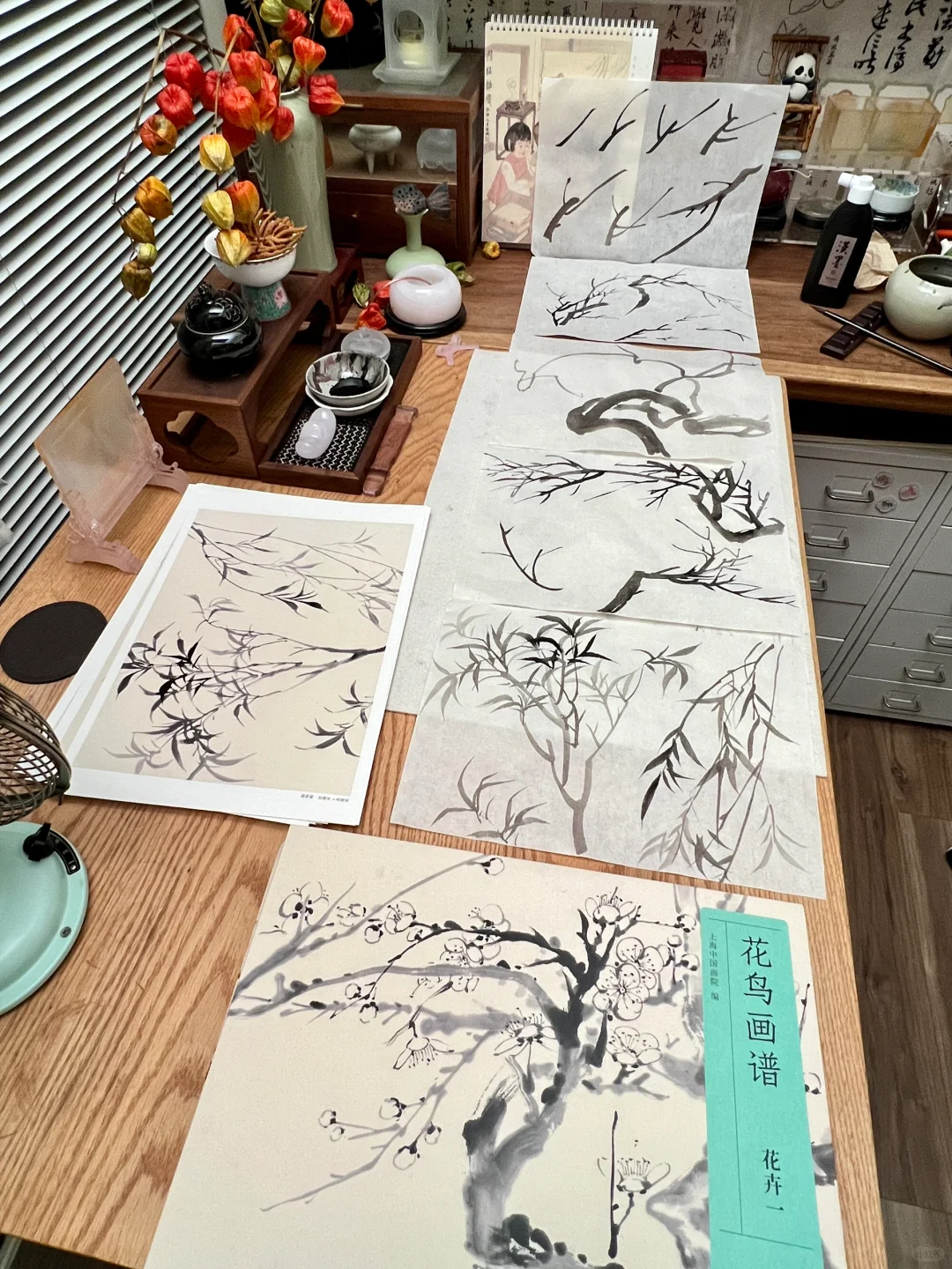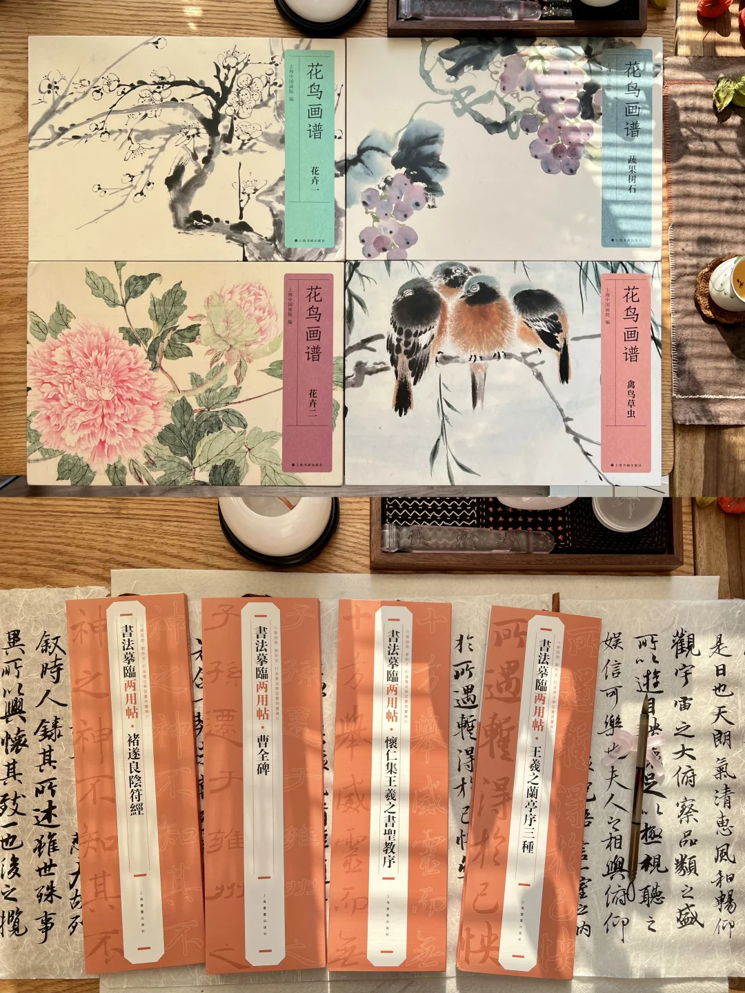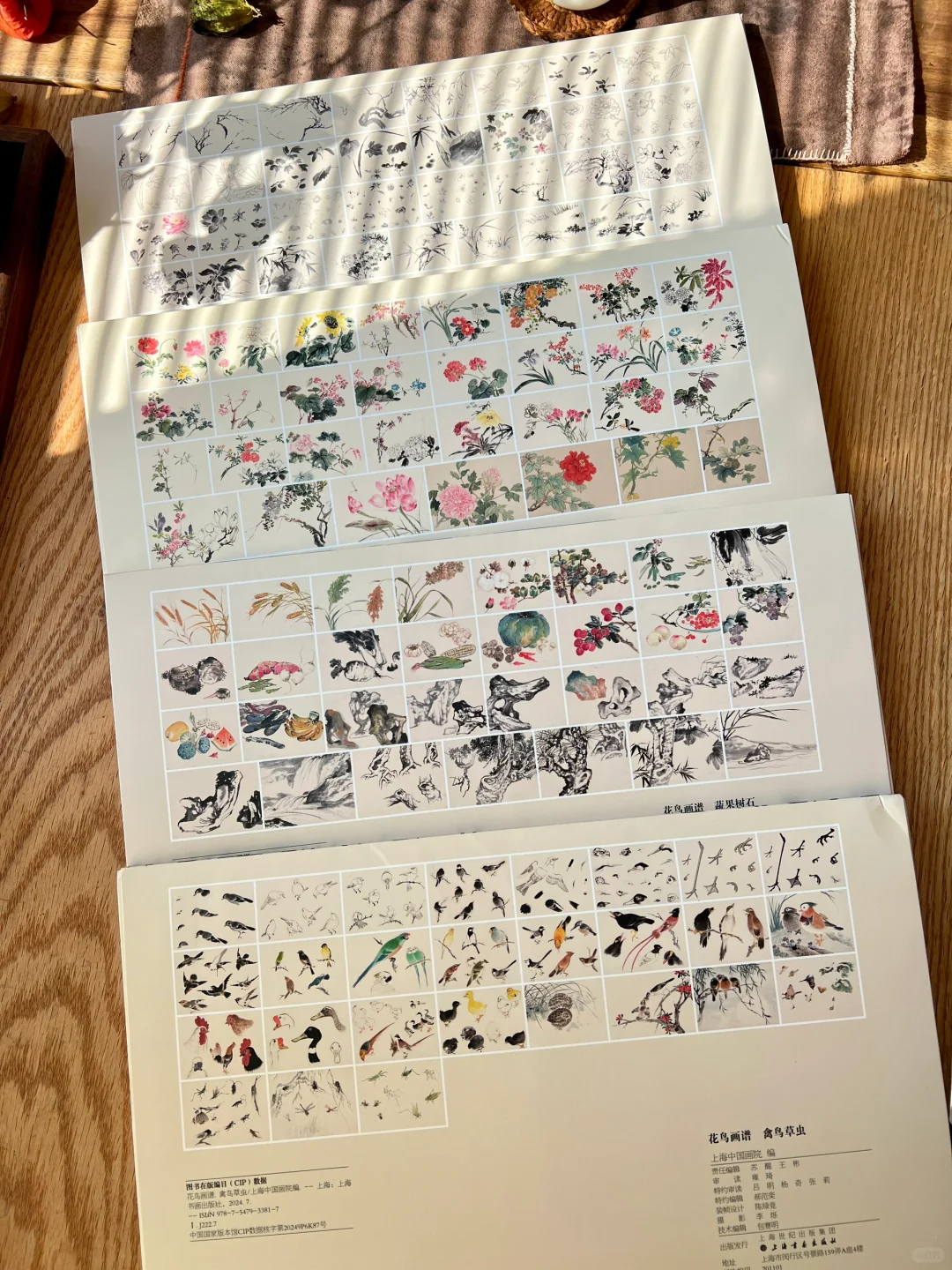 《花鸟》画谱这四册,从最简单树枝开始,到花果树石鸟虫,浓淡墨色入色彩,逐步分解提升。