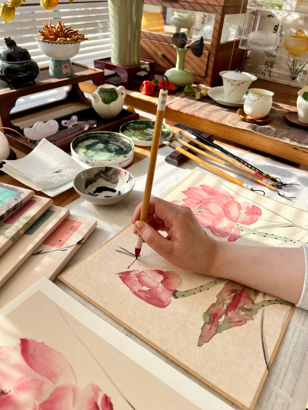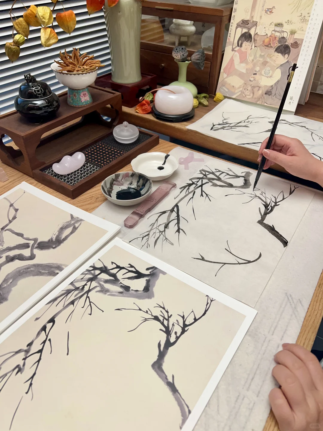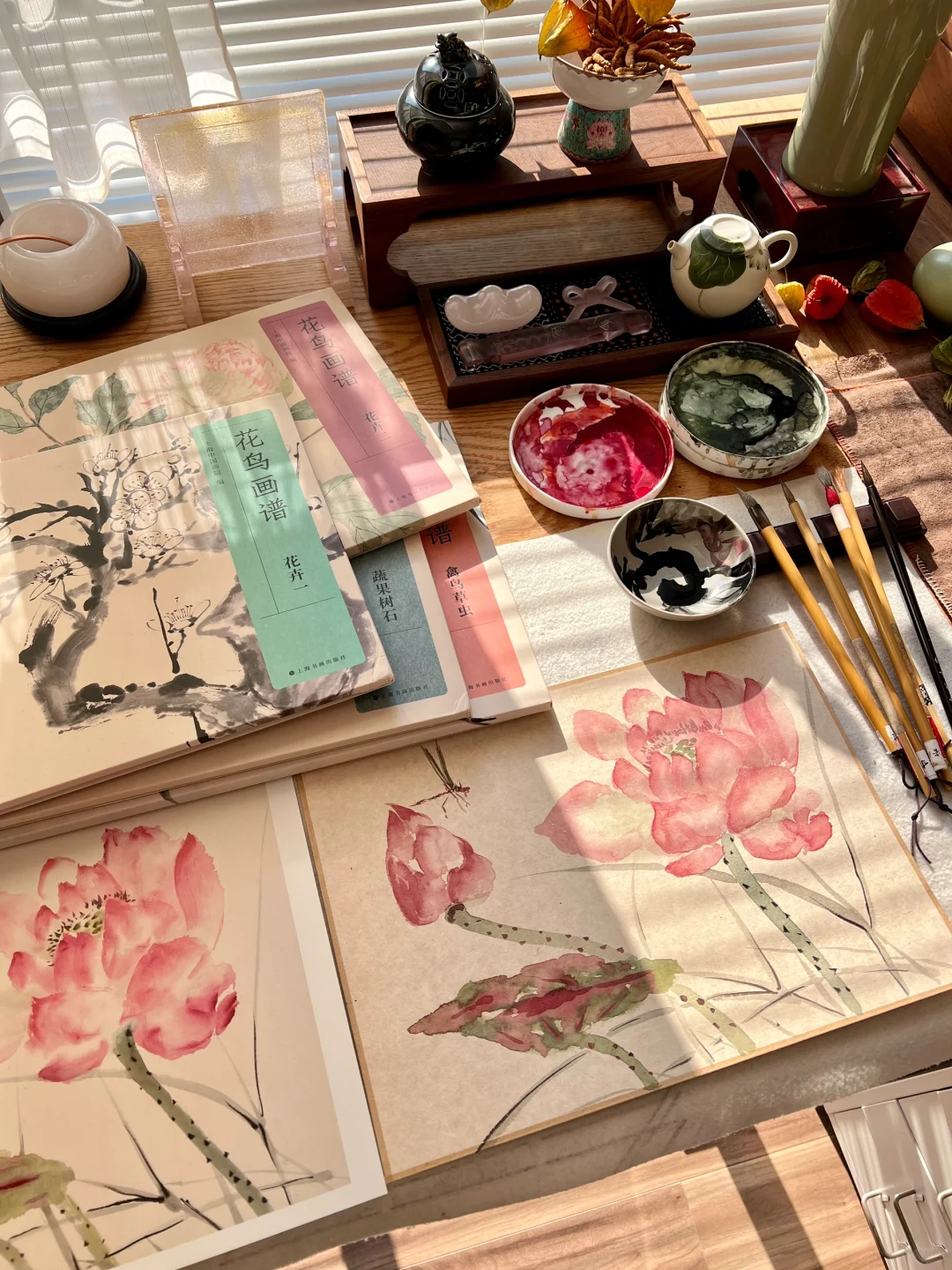 《花鸟》画谱这四册,从最简单树枝开始,到花果树石鸟虫,浓淡墨色入色彩,逐步分解提升。