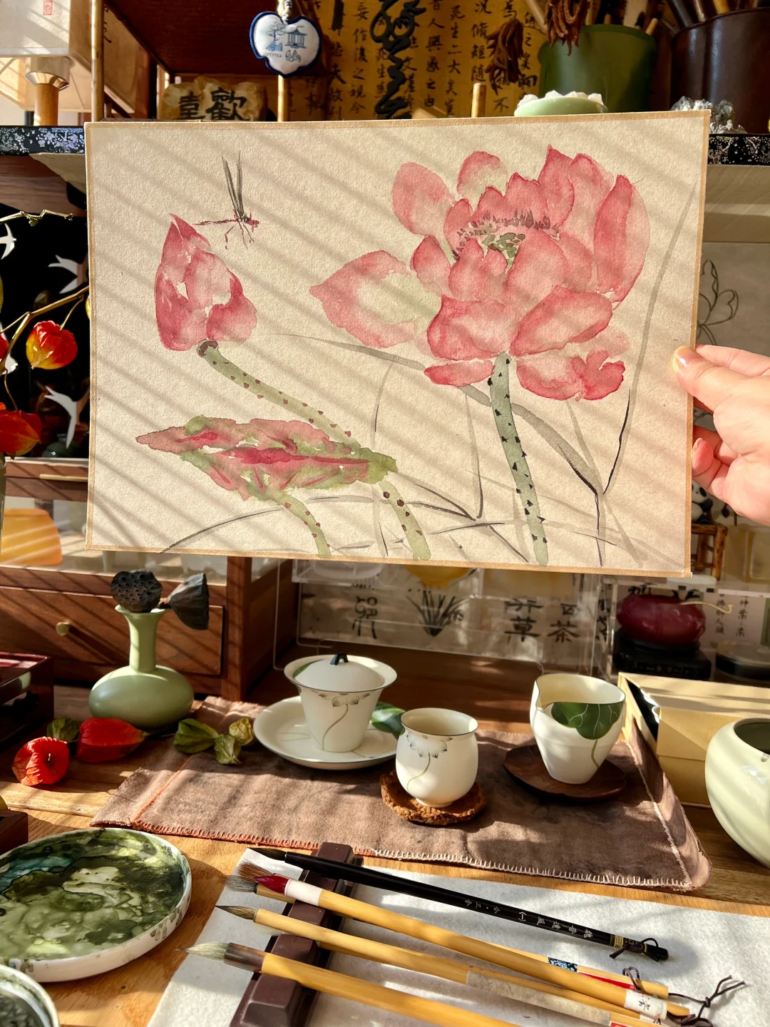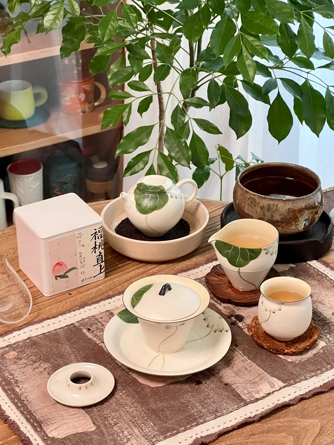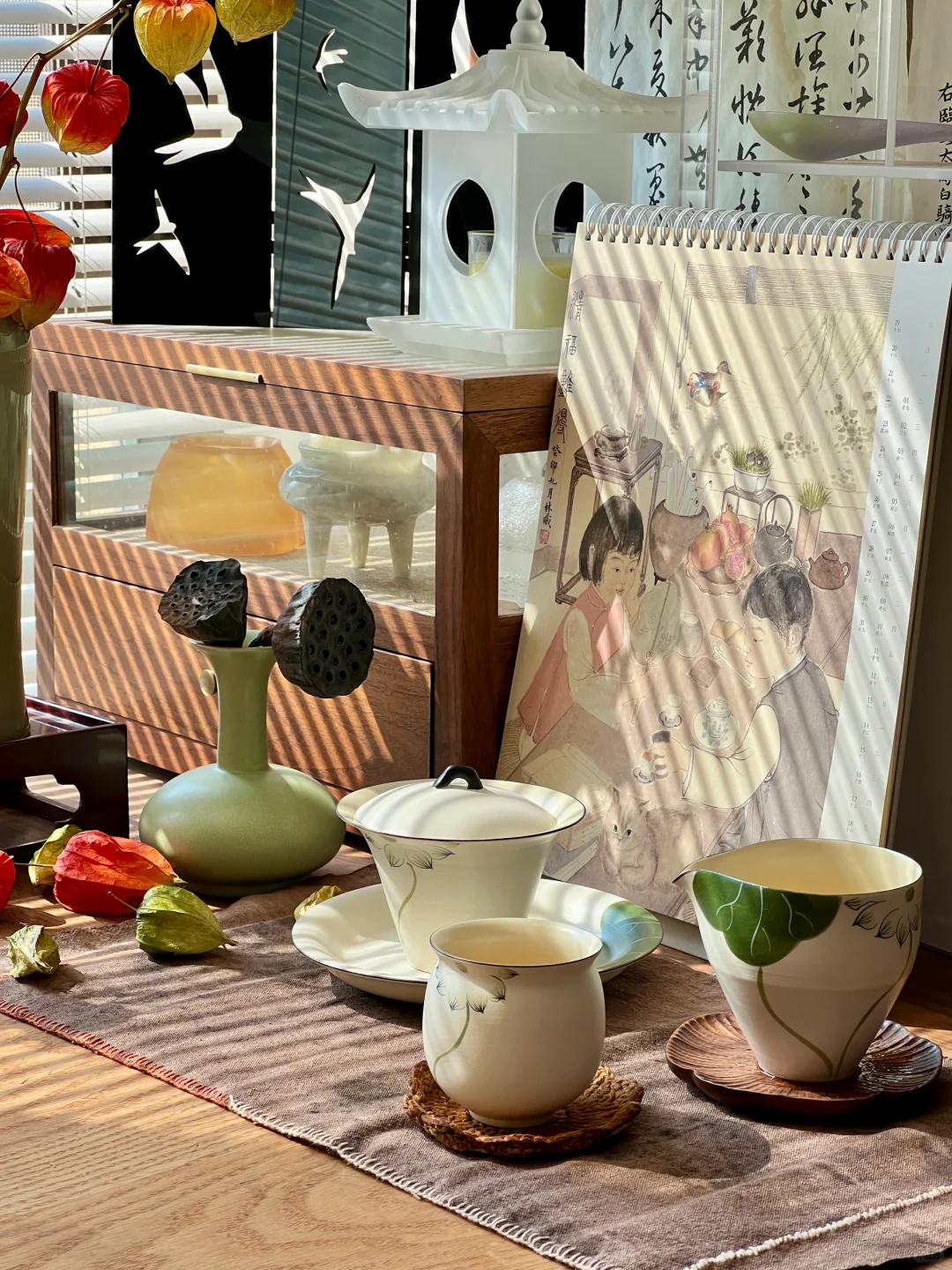 新入了一套粉引的荷塘茶具,绿色很是清雅,荷花季节已过,把荷塘留在了茶席。