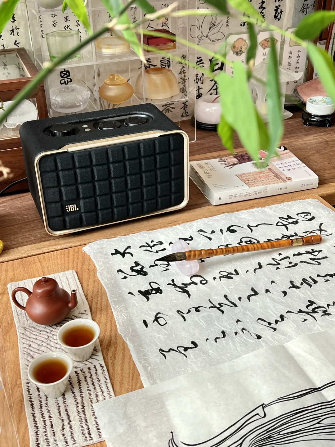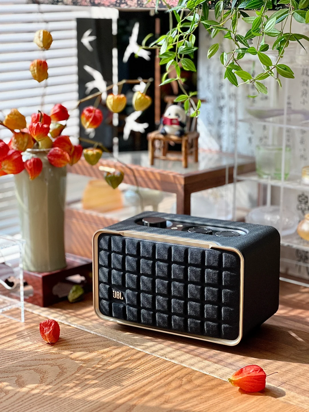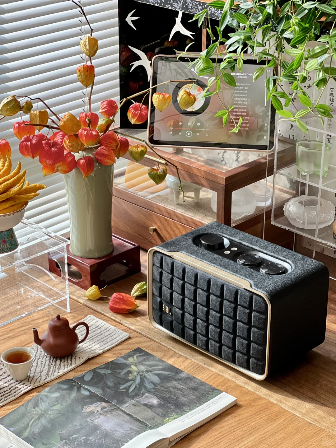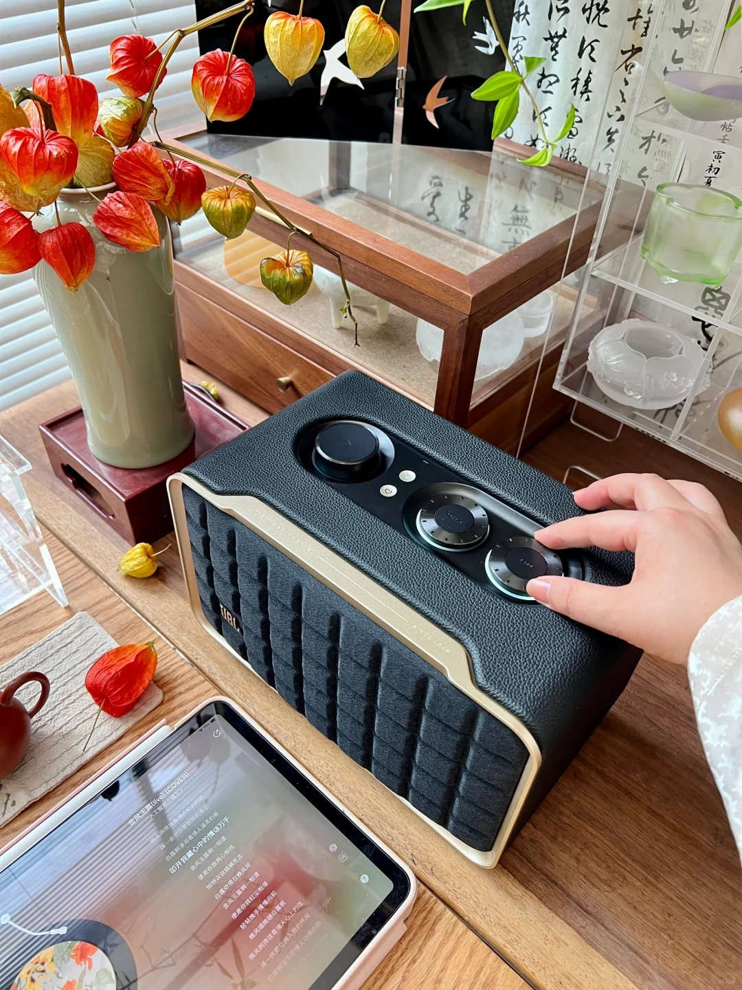 桌案上音乐世家200音响,高级的黑金配色,皮革和金属碰撞,复古、低调又彰显品质。