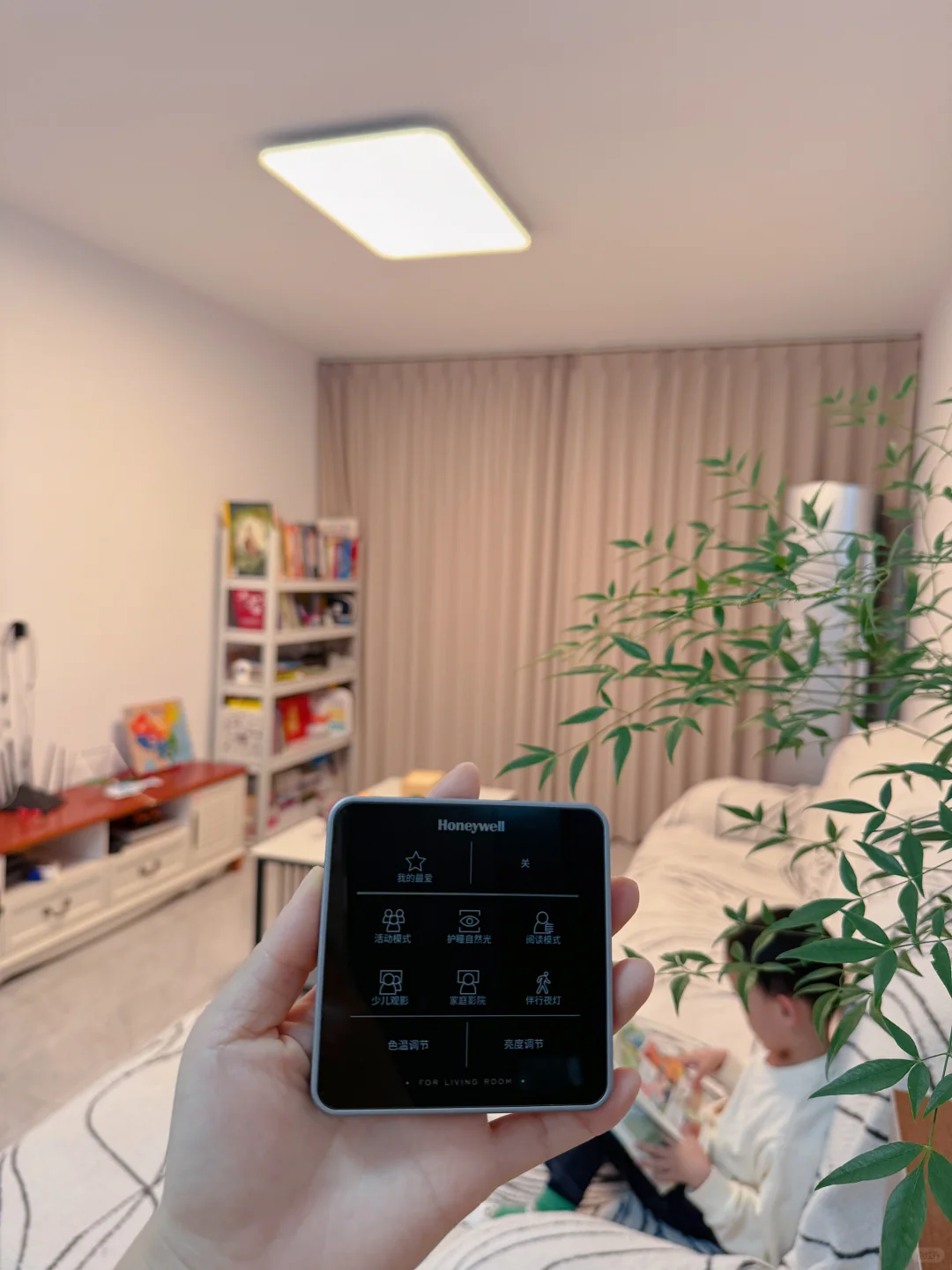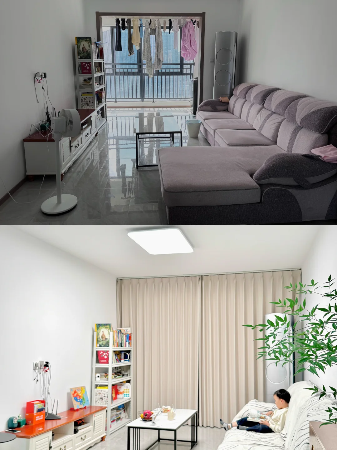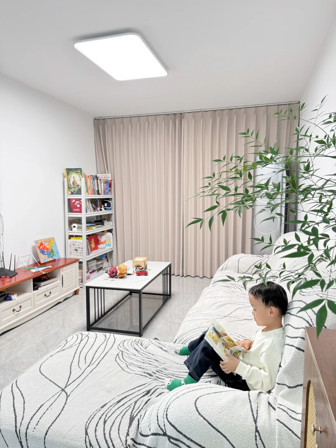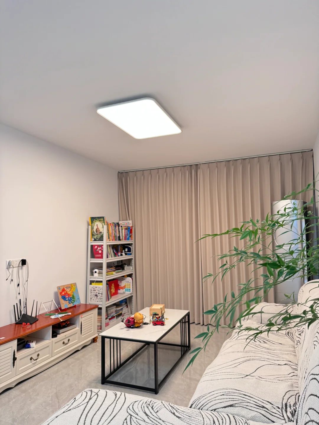家具配套什么肯定不如自己家里,客厅面积挺大,原本只有一个很基础的💡,晚上会有光晕,孩子还很喜欢在客厅看书,所以我首先想到的是换灯!不然两年下来对孩子👀伤害太大,住进来第一件事安排护眼吸顶灯,现在家里夜晚也接近白天的自然光,还有6种护眼模式可以切换,为了👶这笔💰必须花!