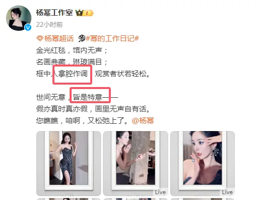 因为出席时尚活动,杨幂准备充分,现场也是美得很突出。她的工作室是这么用词宣传她的:“拿腔作调”“皆是特意”,怎么听也不是好词,我就当是自黑好了。