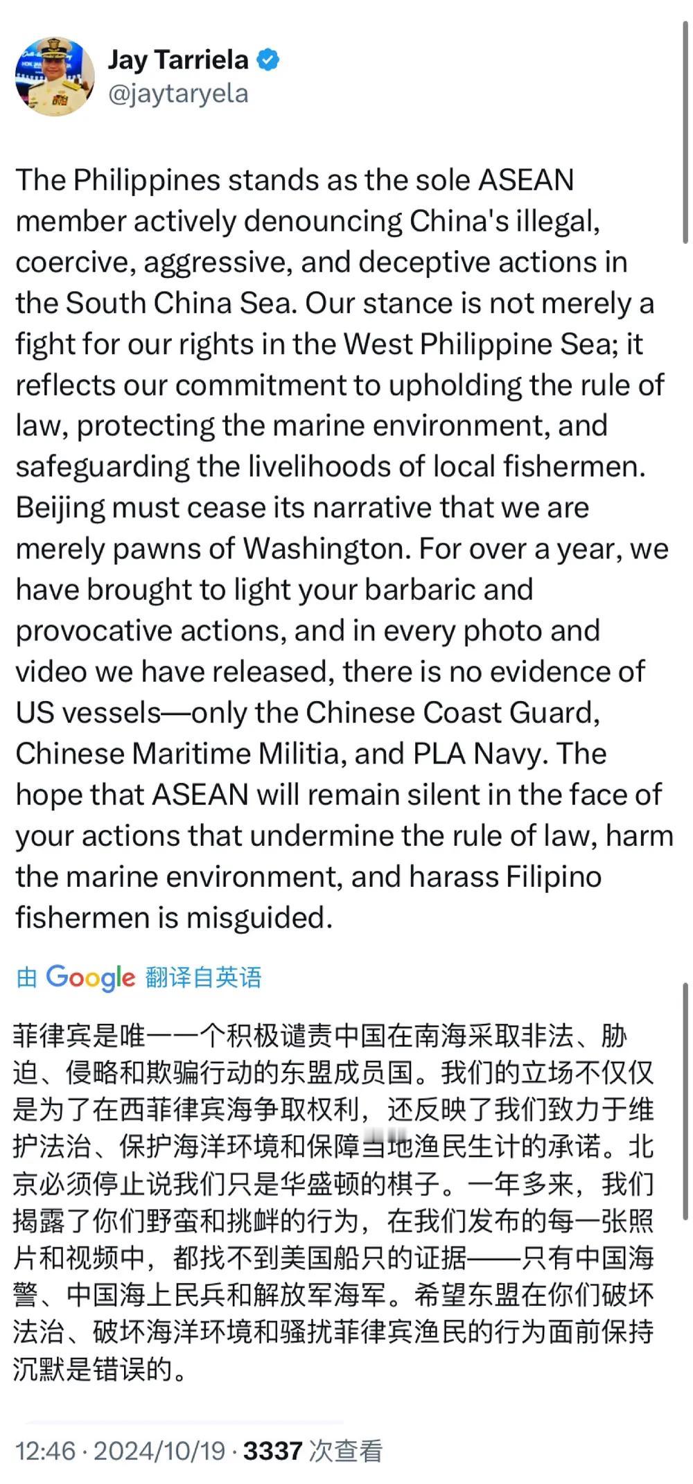菲律宾海岸警卫队发言人杰伊·塔瑞拉(Jay Tarriela)今天(10月19日)抱怨道:“菲律宾是唯一一个积极谴责中国的东盟成员国……北京必须停止说我们只是华盛顿的棋子。……在我们发布的每一张照片和视频中,都找不到美国船只的证据……东盟在你们破坏法治、破坏海洋环境和骚扰菲律宾渔民的行为面前保持沉默是错误的。”(全文见图二) [机智]评几句:菲律宾海岸警卫队发言人的言论充分说明了两点。第一,菲律宾被东盟及其成员国孤立了,没有其他东盟成员国“声援”对华挑衅的菲律宾,全部都采取了默不作声的态度。第二,没有美国舰船,也再次证明了拜登政府对菲律宾的“口惠而实不至”。每次事发时,美国舰船统统消失不见;每次事发后,美国国务院则高呼与菲律宾坚定地站在一起。希望菲律宾不要继续冥顽不灵。