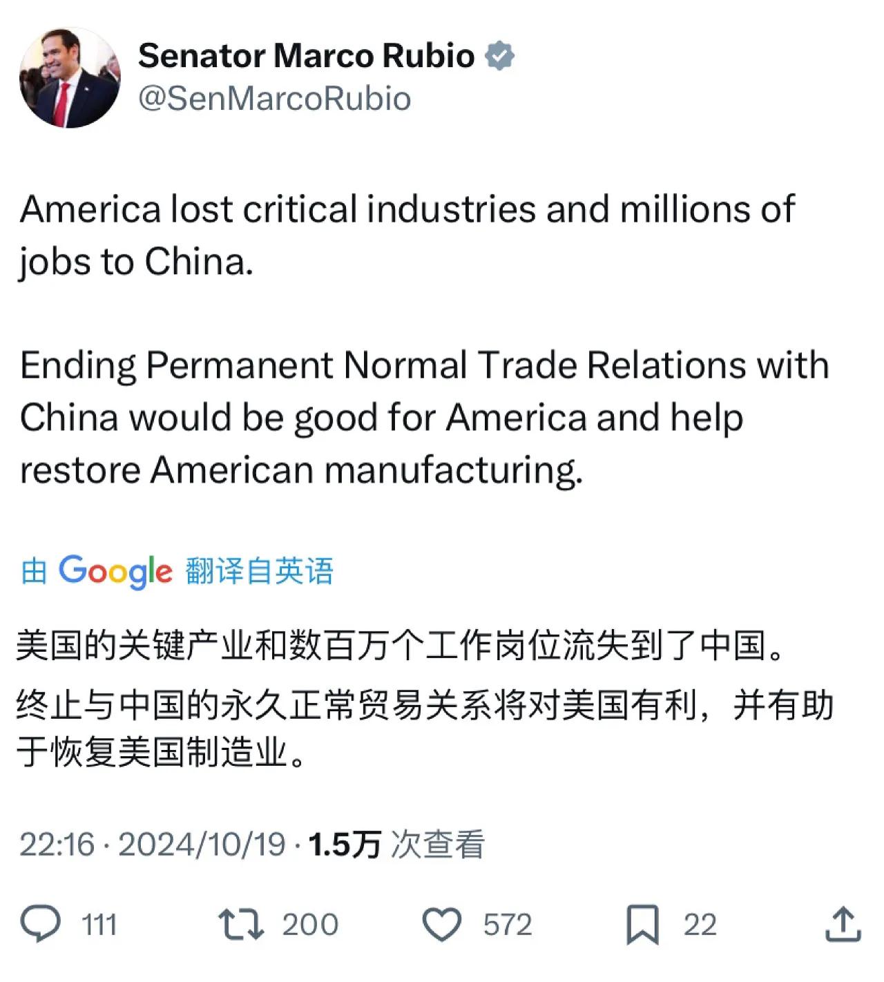 被我方制裁的美国共和党籍参议员卢比奥昨晚(北京时间10月19日晚)叫嚣道:“美国的关键产业和数百万个工作岗位流失到了中国。终止与中国的永久正常贸易关系将对美国有利,并有助于恢复美国制造业。” [机智]评几句:美国制造业工作岗位的流失并不是因为中国,而是因为美国自己。制造业的工作岗位会流向生产链配套齐全,且劳动力成本具有优势的国家或地区,所以美国希望再工业化或者希望制造业的就业机会流回美国,可能性已经不太大了。
