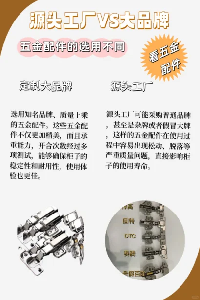 源头工厂采购普通品牌,甚至是杂牌或者假冒大牌,这样的五金配件在使用过程中容易出现松动、脱落等严重质量问题,直接影响柜子的使用寿命。