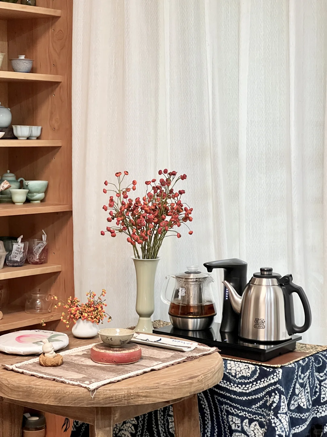在这里更多的时候是闲暇放松和休息,所以茶具配件也配置很齐全。更多时候闷上一壶普洱或老白茶,慢悠悠的摆弄花草,溜达收拾一下房间。