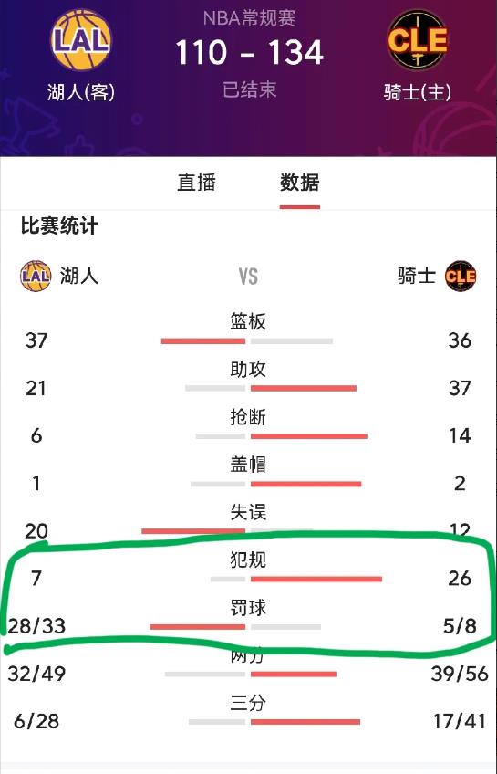 犯规数湖人全场竟然不上双,仅有7个,这太不可置信了吧,是不是一项纪录呢,别的队一节都够这个数了,对面的骑士是26个犯规,平摊到每一节都会犯满,自然的,湖人的罚球也就随之而大涨,全场获得了33个罚球,比骑士多了25个,后者都没上双,哈哈哈。
