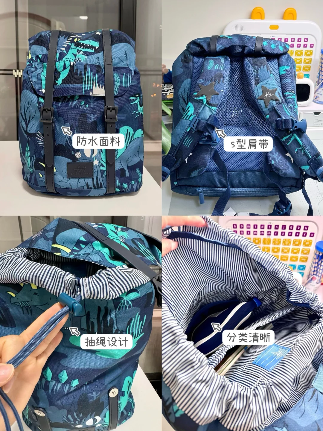 入学的时候买的,当时考虑一年级装书本➕学习用品,所以选择了分类比较清晰且自重只有840g的护脊书包,孩子背上去就比较轻松,22L里面空间还是很大!水杯、跳绳、书本放进去毫无压力,而且款式是比较百搭日常的,带小朋友户外出游的时候也可以背