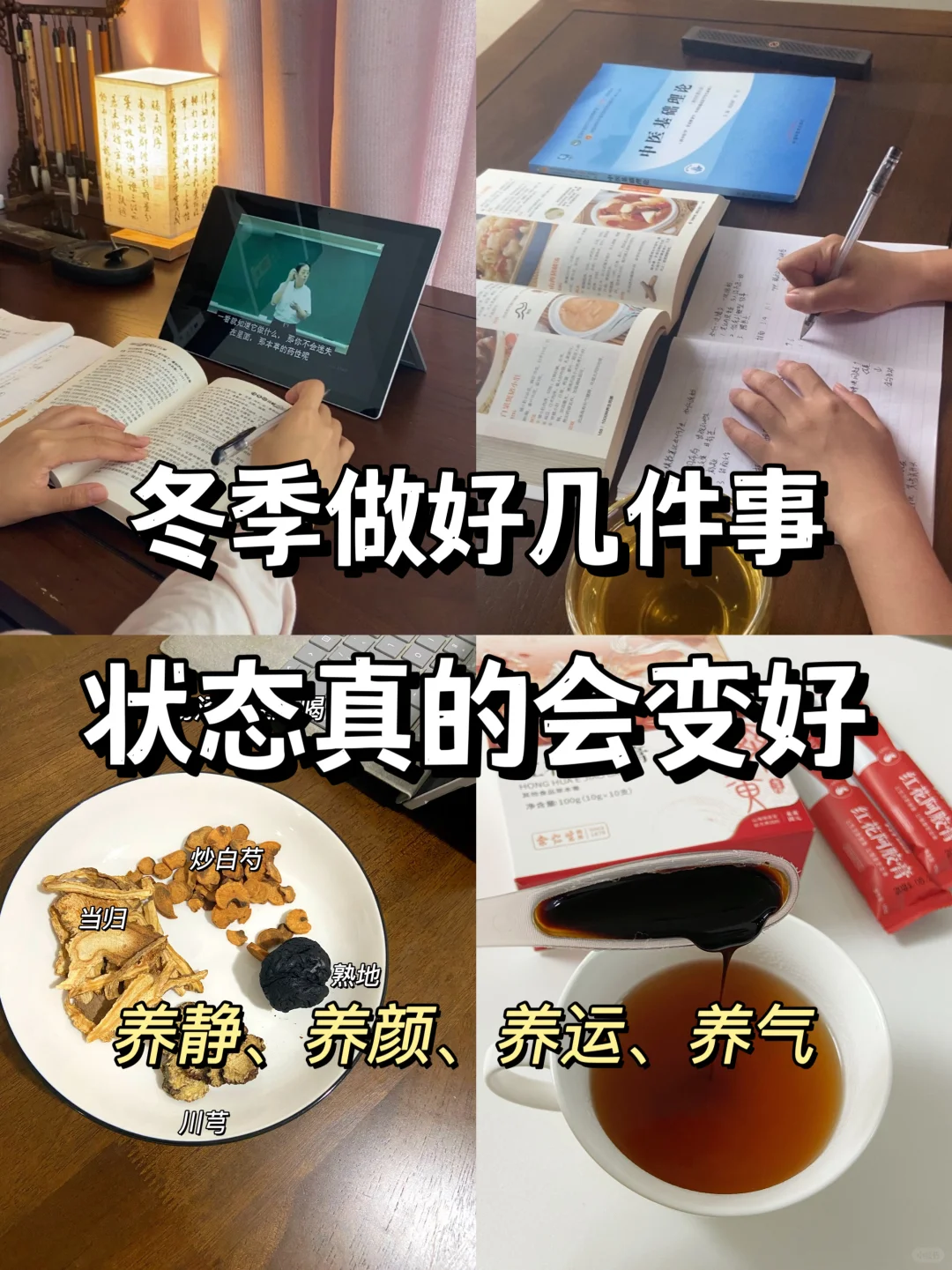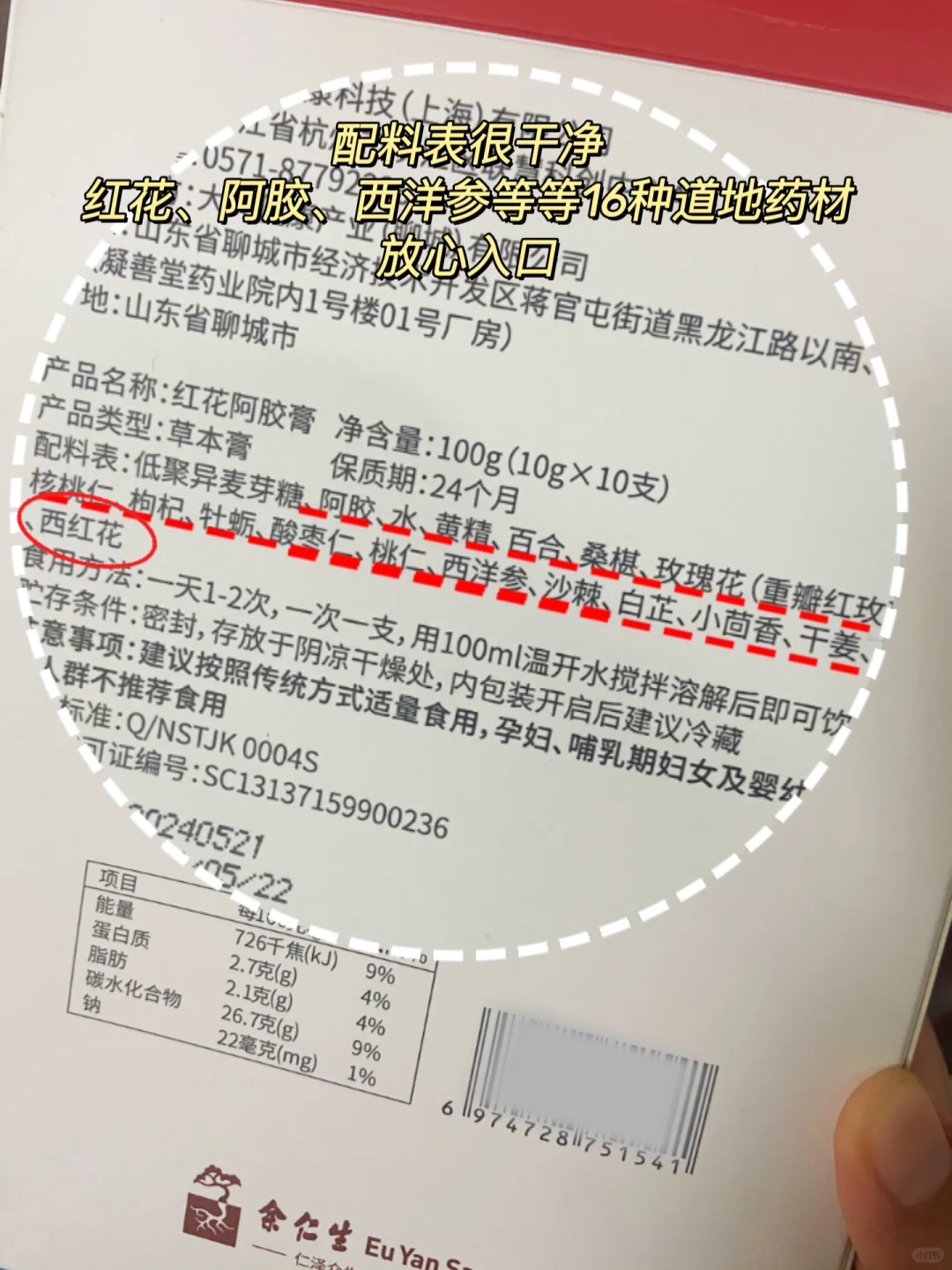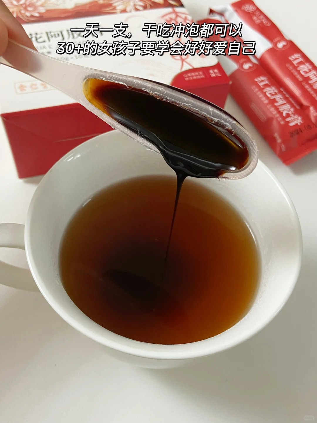 平时我会煮四物汤+日常会吃一些阿胶,善用【阿胶】,身体就开窍了,都是实战分享。到了冬天不方便做养颜水和熬粥的时候,我都会泡上一杯余仁生他们家的红花阿胶膏来喝。因为是入口的东西所以我比较慎重,余仁生他们家已经有145年的历史了,在香港和新加坡都见到过他们家的门店,所以在品牌和质量上我是比较放心的。而且配料表也很干净,16种道地药材,无蔗糖我很安心。在闲暇时间我还会用它来搭配各种特调饮品,一天一勺这个份量是能稳稳把控,也不担心变质。