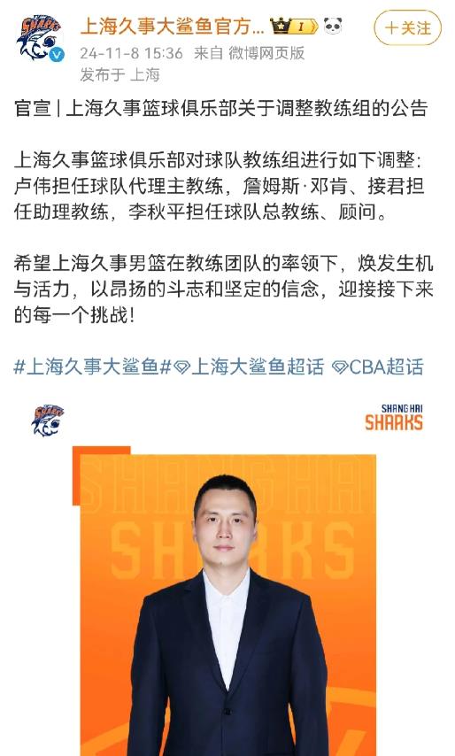 上海男篮继续调整主教练,这次是队里的本土年轻助理教练顶上。